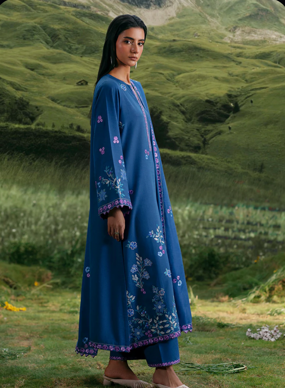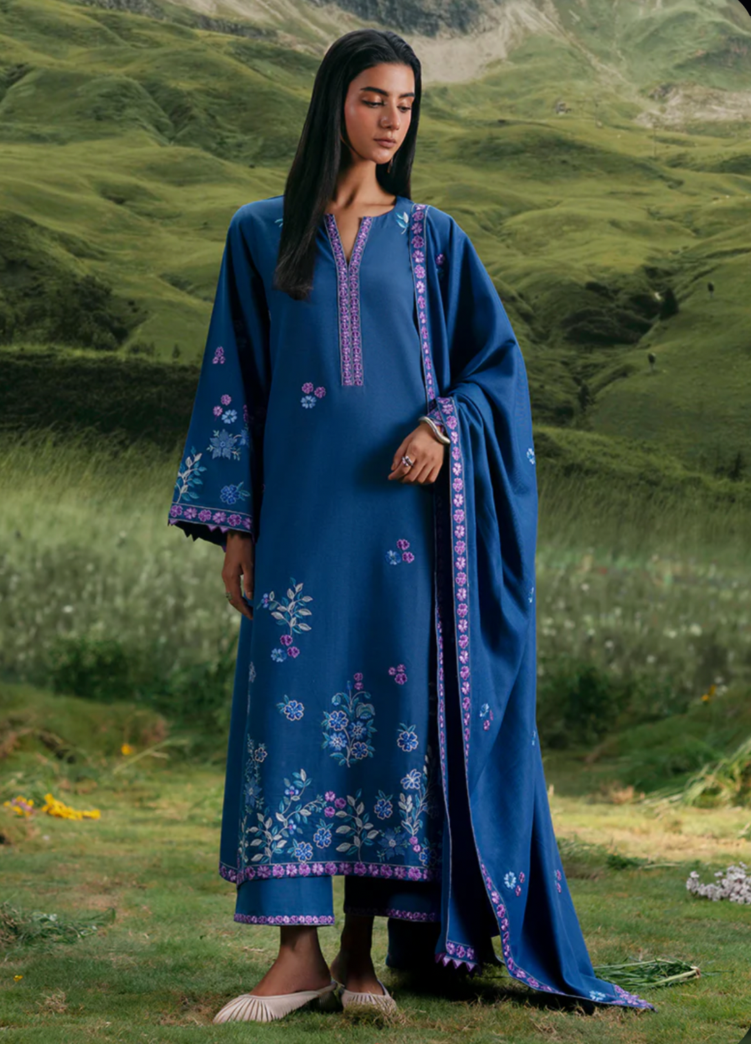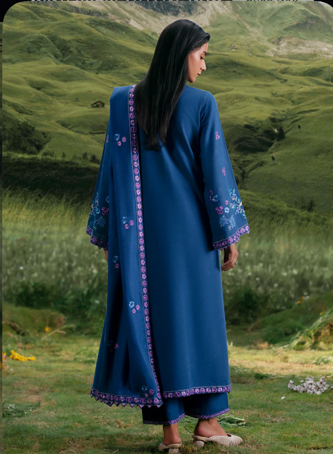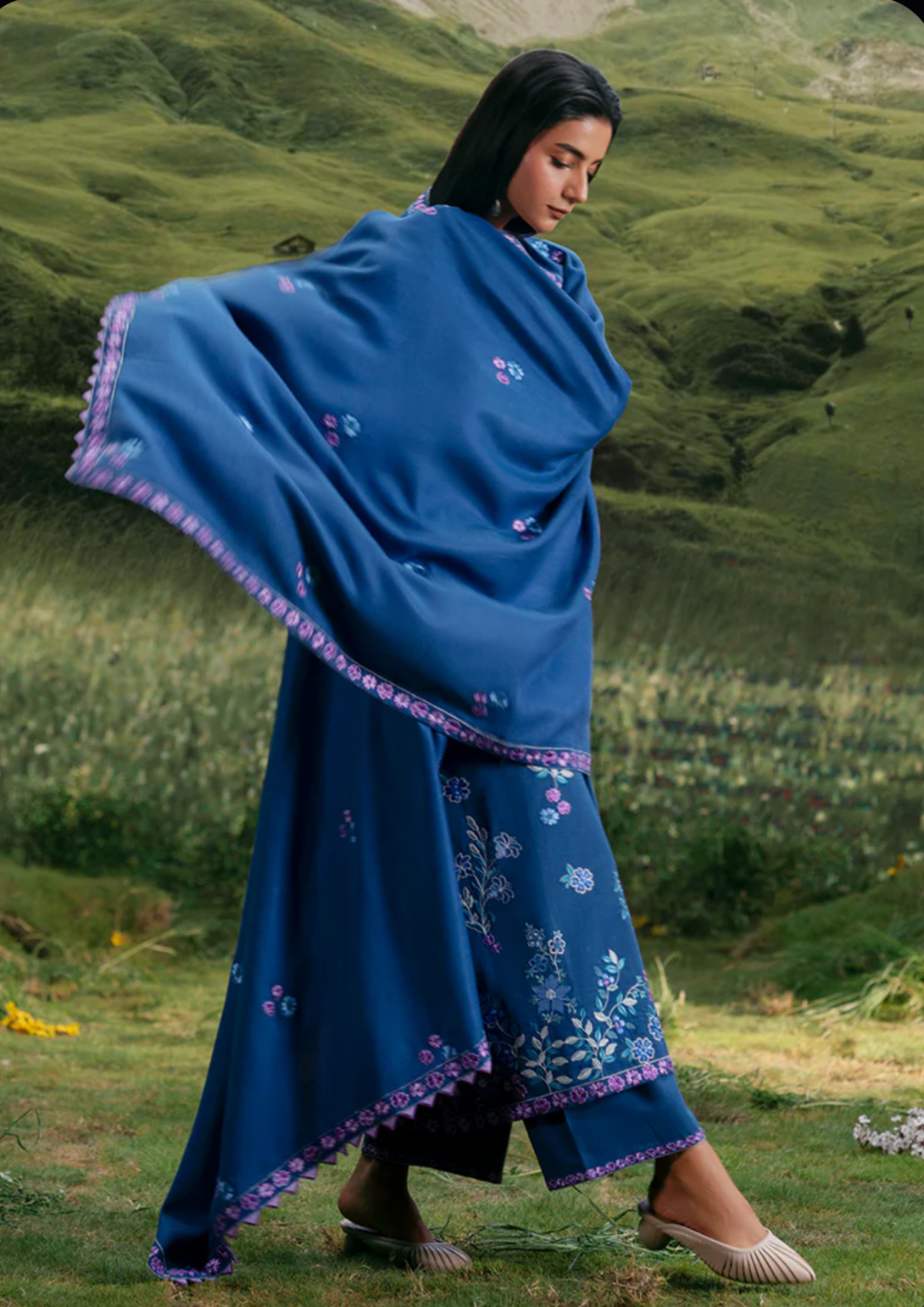 Nava in Blue from our Winterkari '25 Collection. An embroidered khaddar 3pc unstitched outfit paired with khaddar trousers & an acrylic shawl.