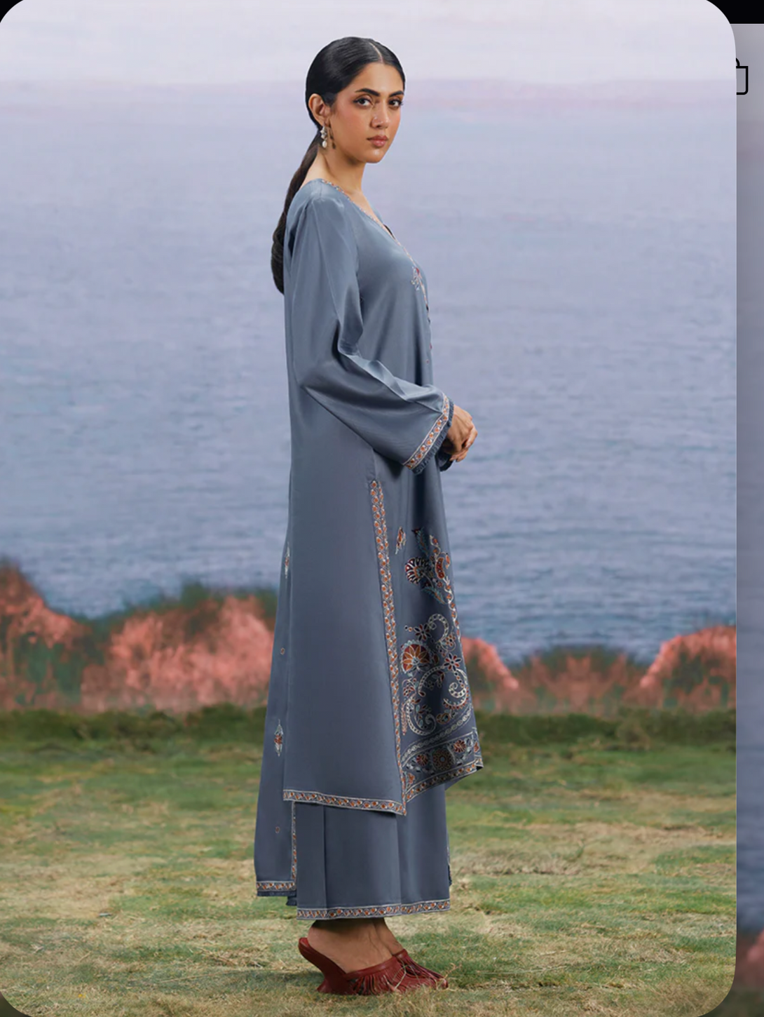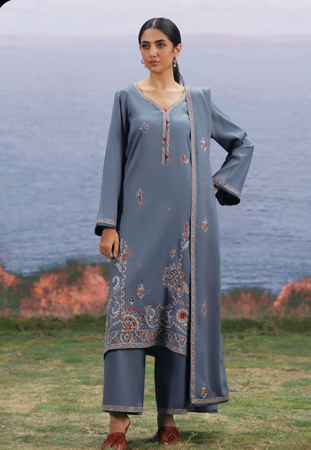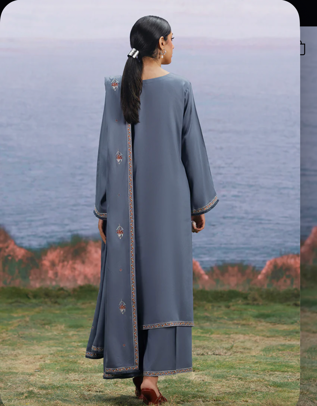Nawara in Periwinkle from our Winterkari '25 Collection. An embroidered twill viscose 3pc unstitched outfit.