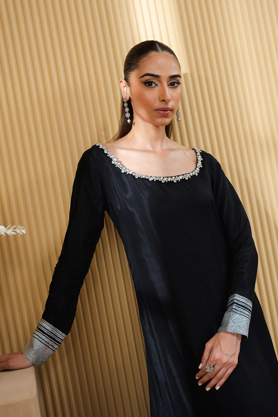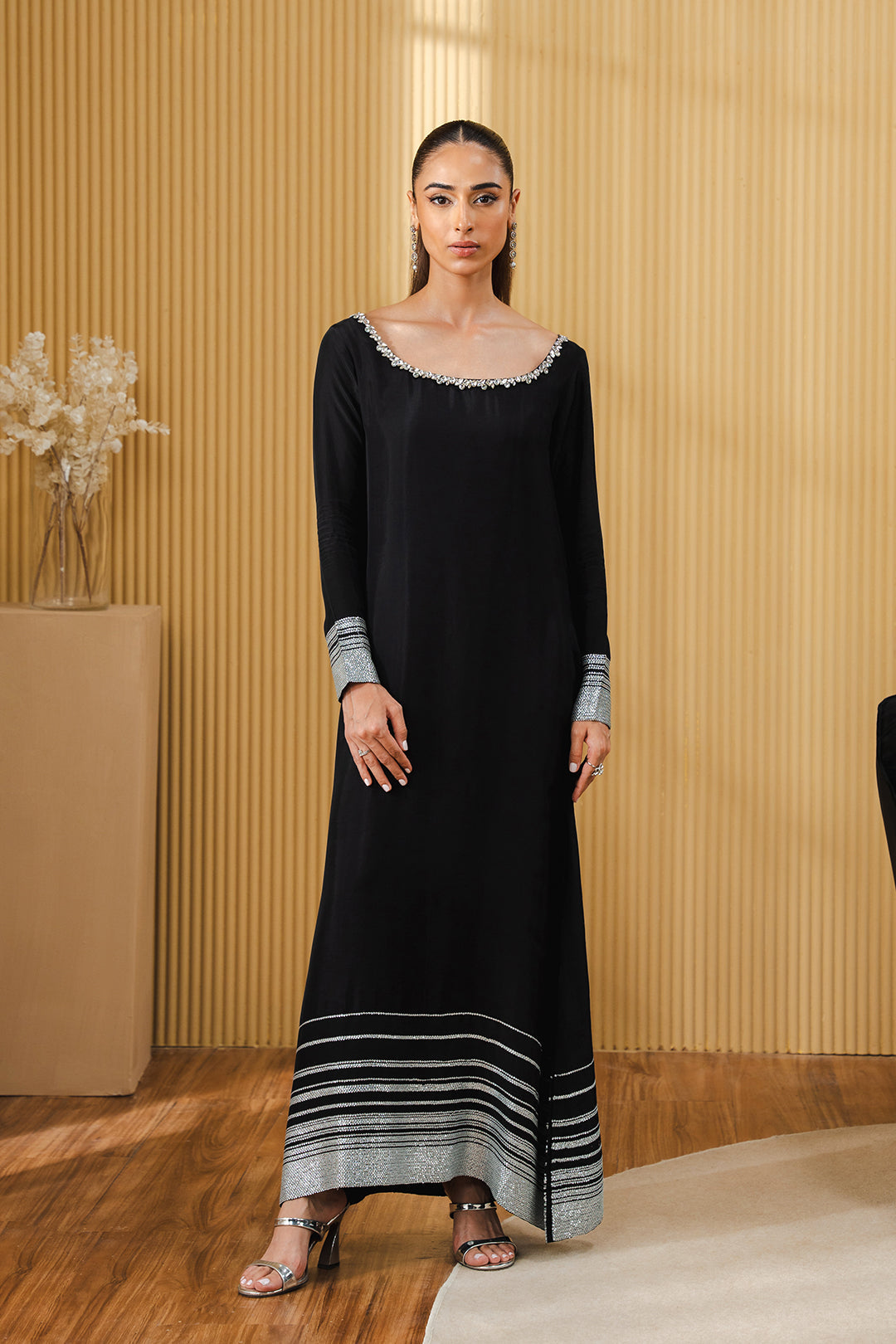 - This dress, made in soft silk fabric, feautures scoop neckline adorned with crystal embellishment, full length sleeves and A-line hem with side slits.