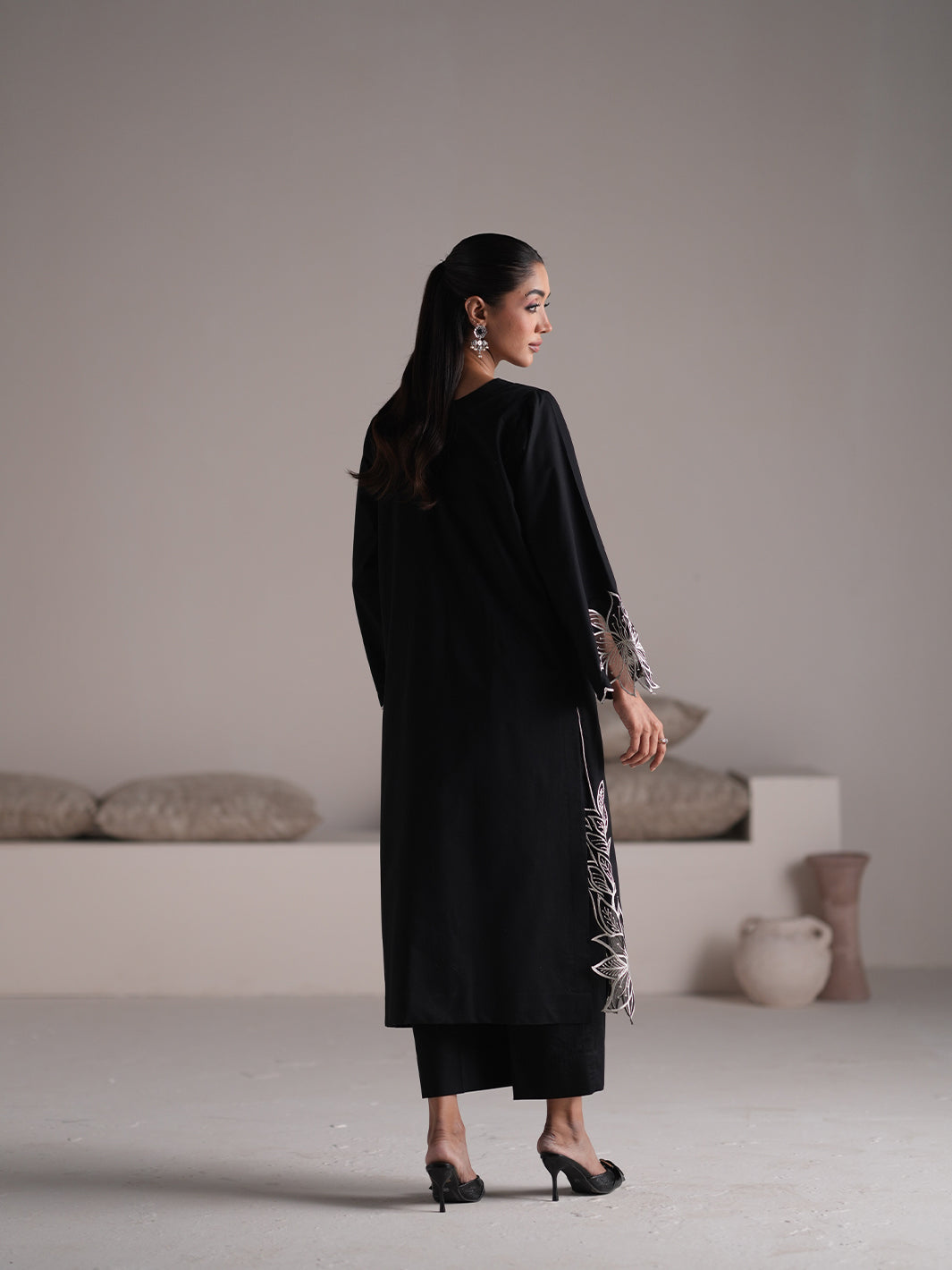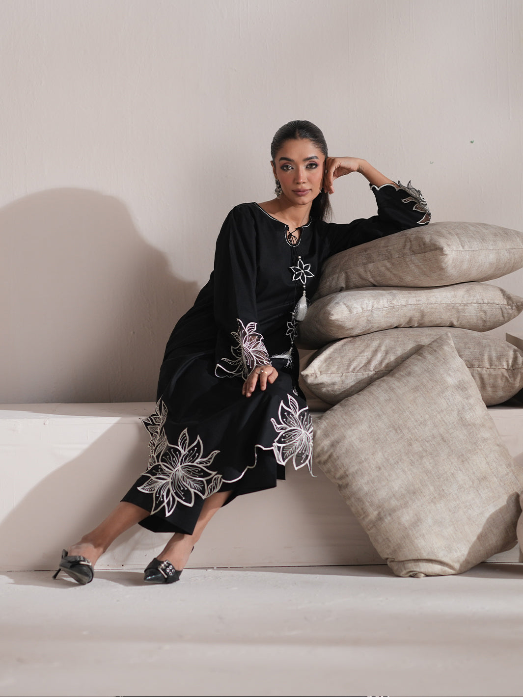 When the world dims, she blooms. Night Bloom is a monochrome masterpiece a jet-black canvas kissed with floral embroidery, as if drawn under moonlight. It's confident without trying, elegant without effort. Perfect for your evenings out, slow gatherings, or just when you want your outfit to say