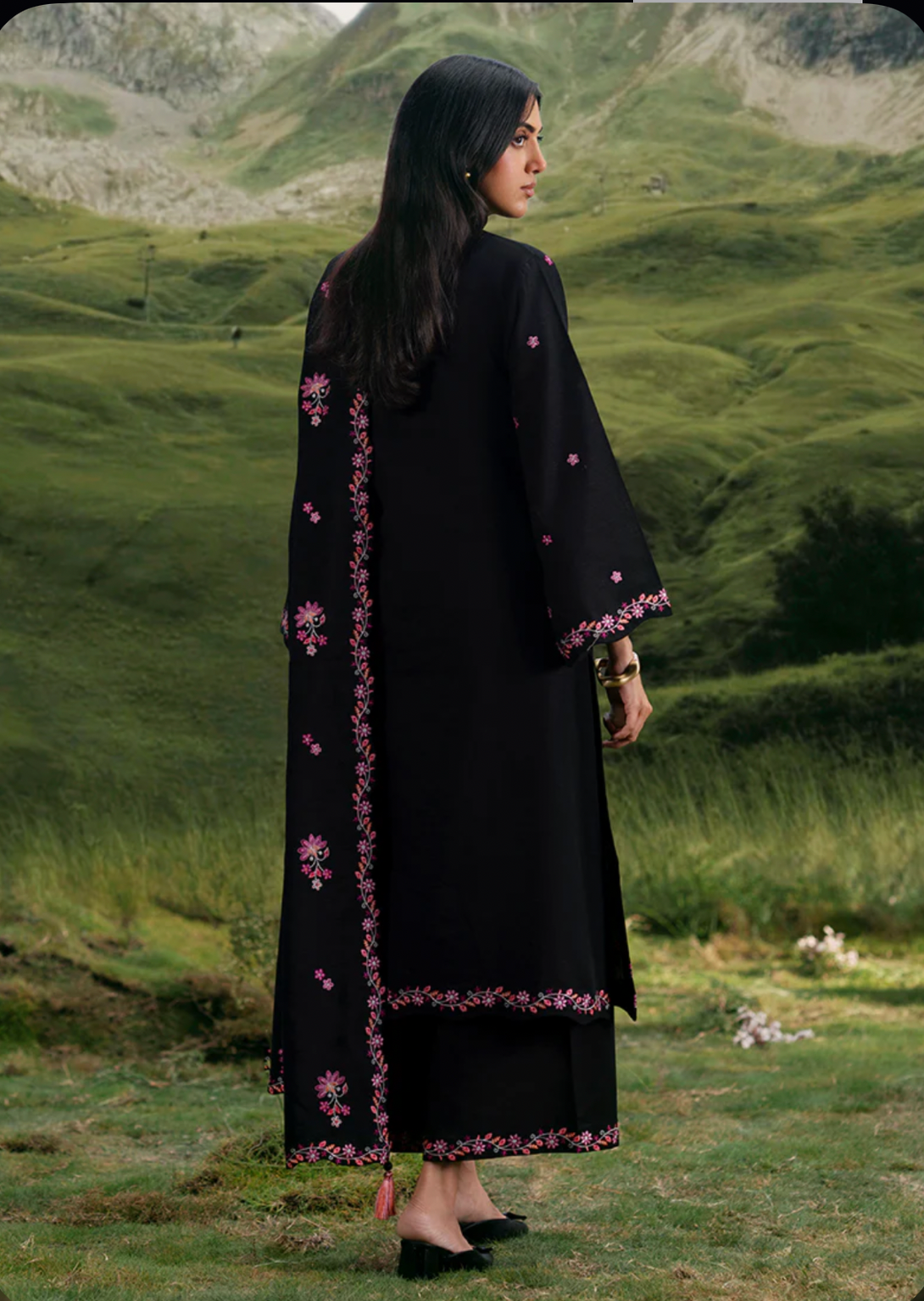 Nilofar in Black from our Winterkari '25 Collection. An embroidered khaddar 3pc unstitched outfit paired with khaddar trousers & an acrylic shawl.