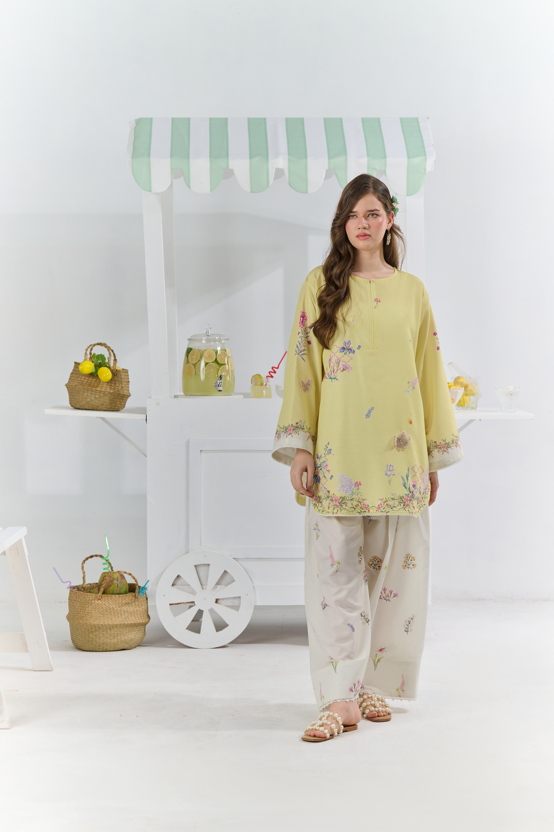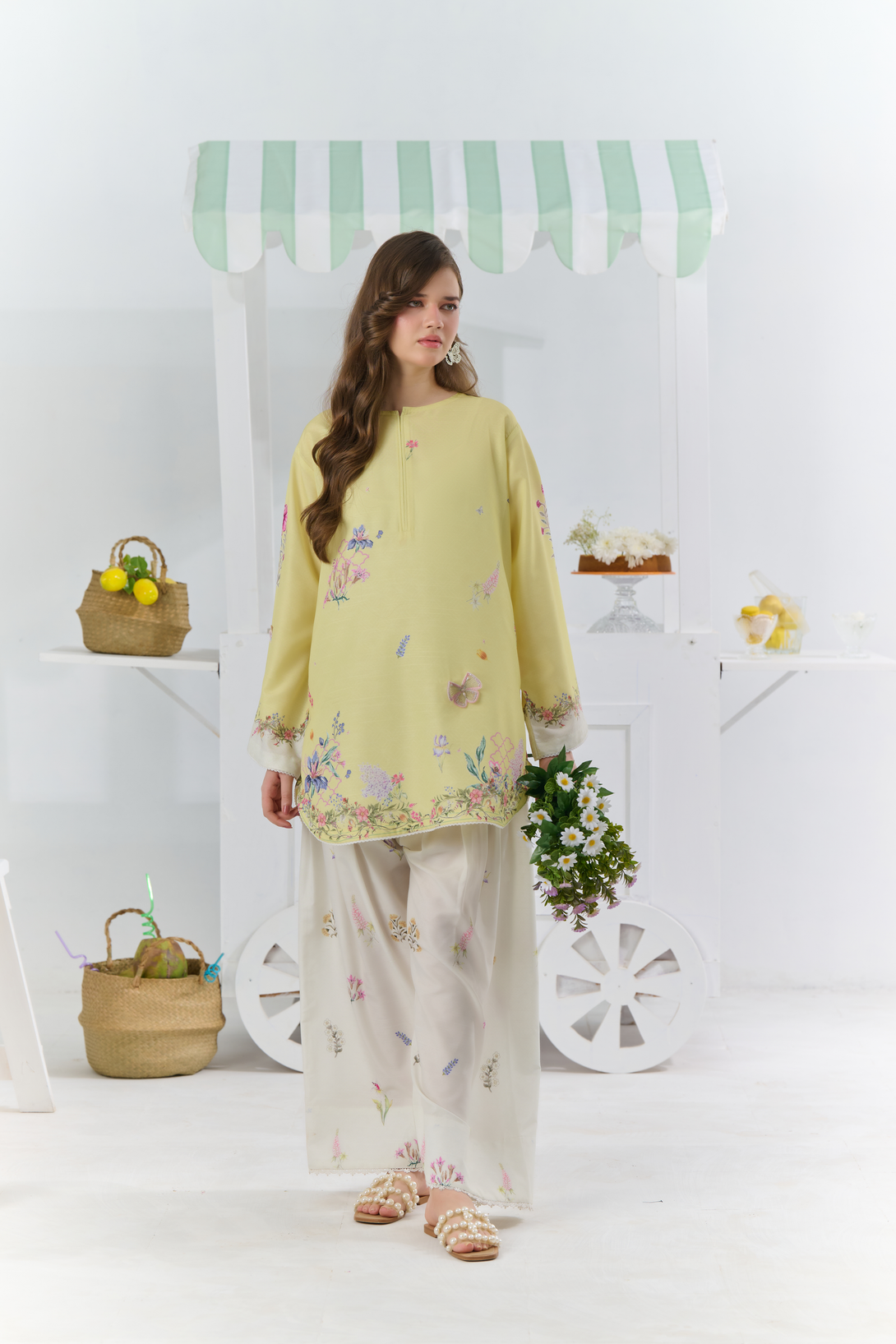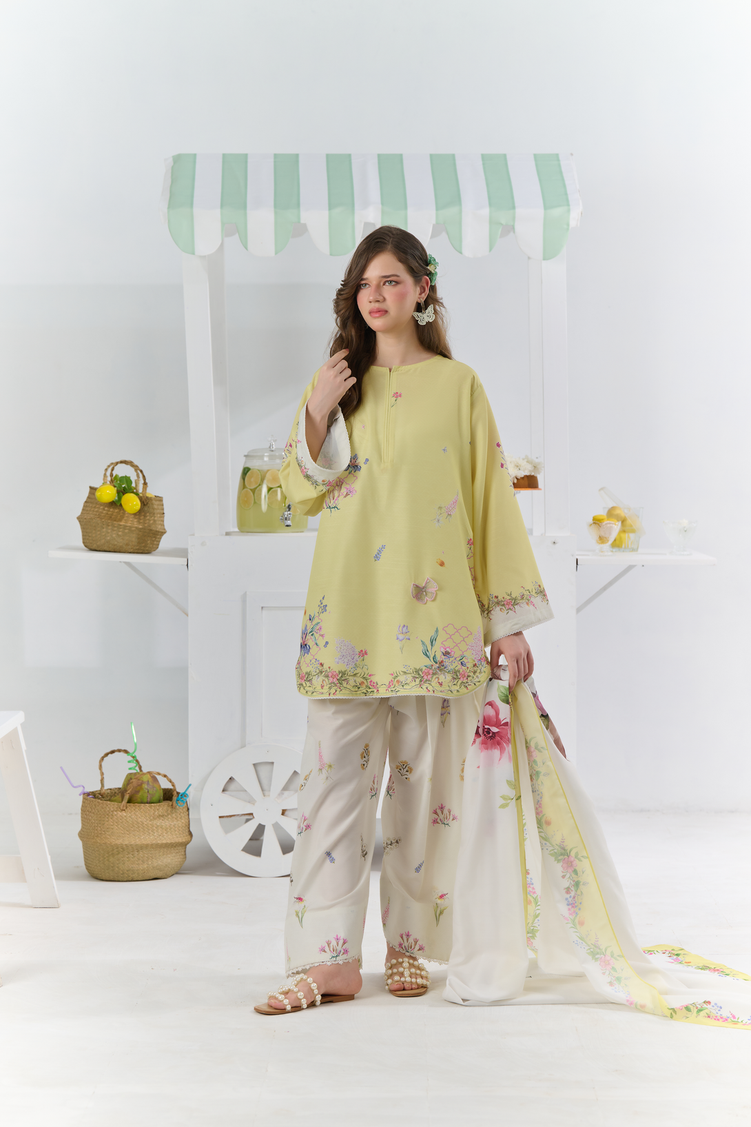 Color: A yellow and off-white set features a vibrant multi-coloured floral print, beautifully accented with subtle embroidered butterflies for a touch of elegance and whimsy.