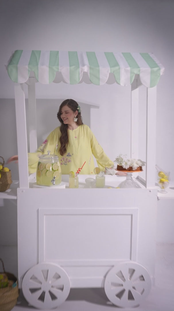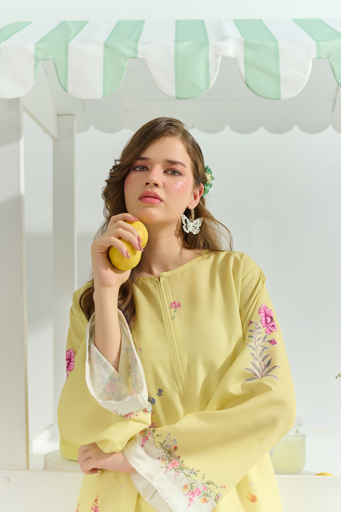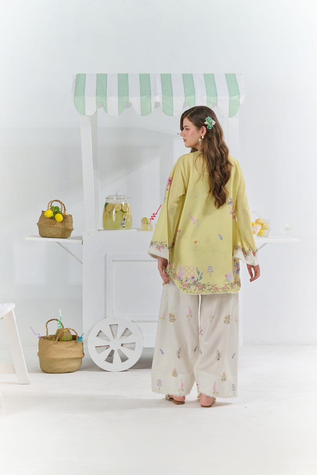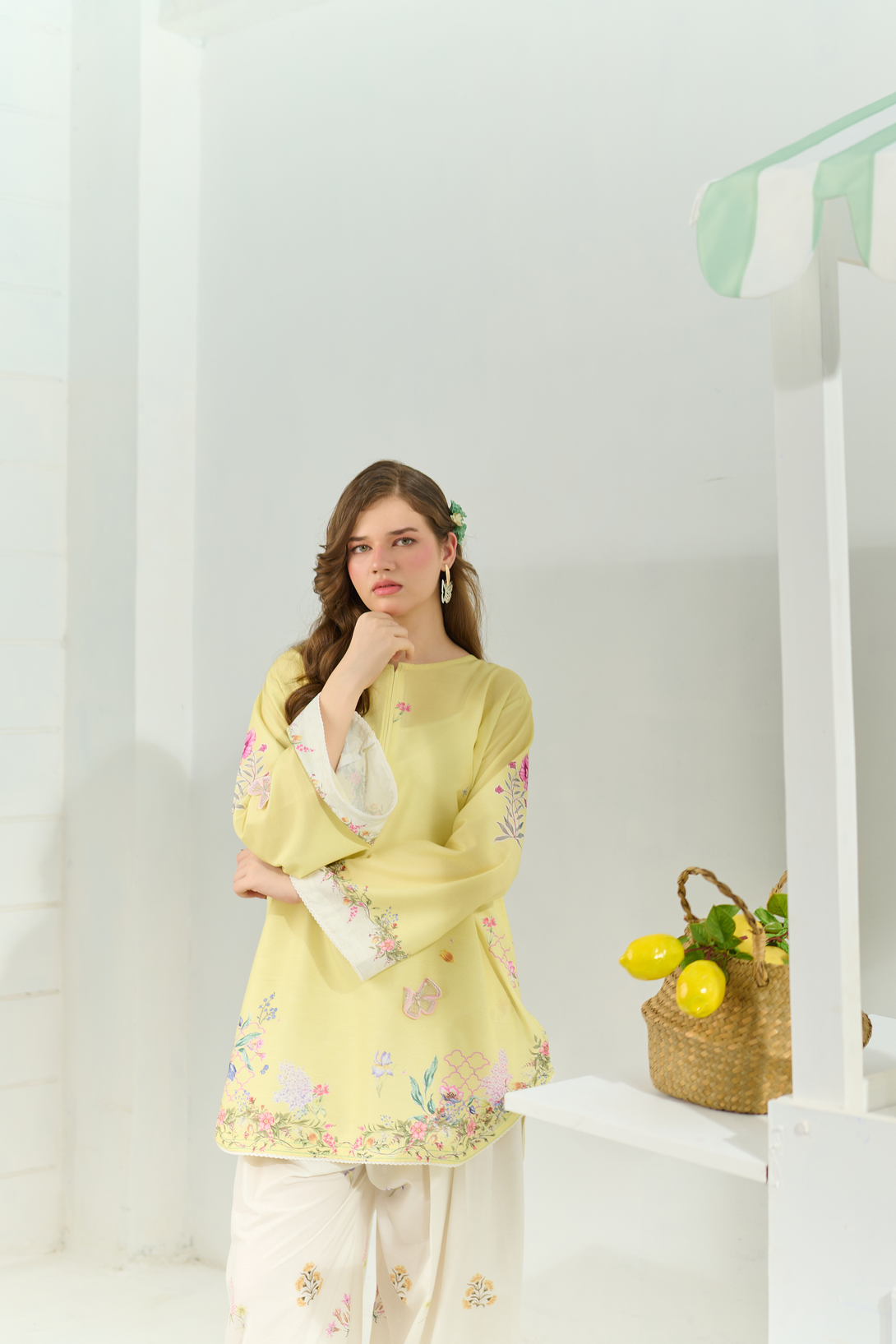 Color: A yellow and off-white set features a vibrant multi-coloured floral print, beautifully accented with subtle embroidered butterflies for a touch of elegance and whimsy.