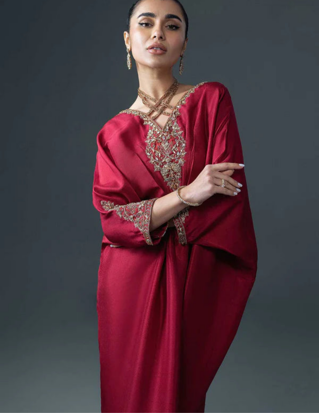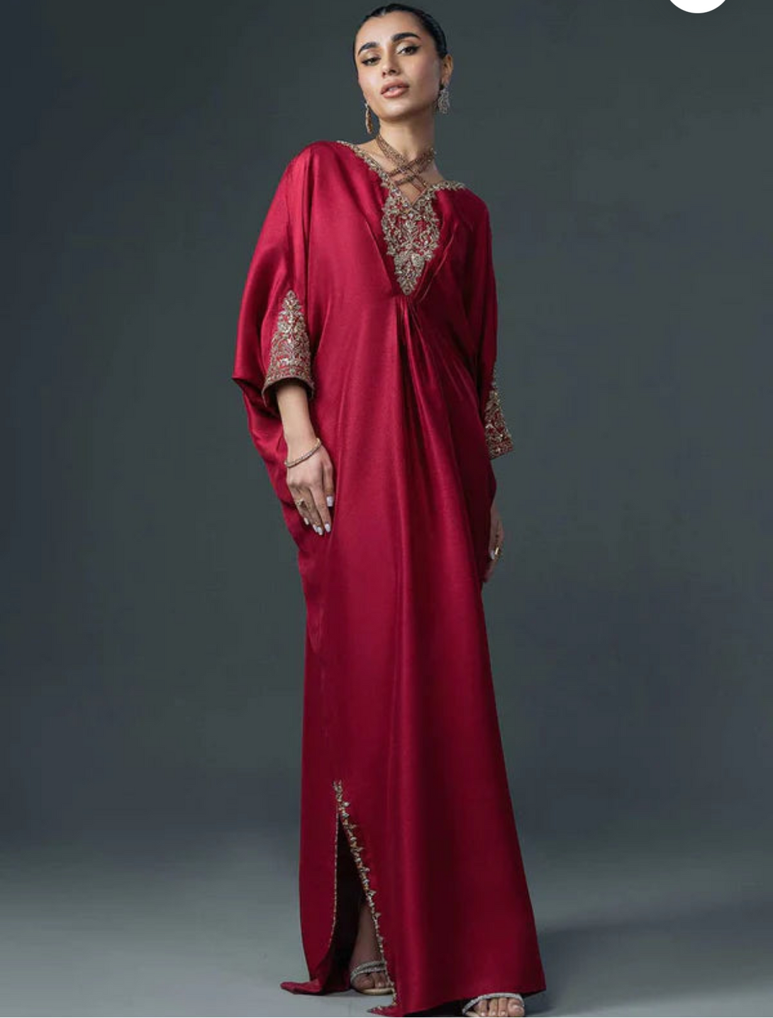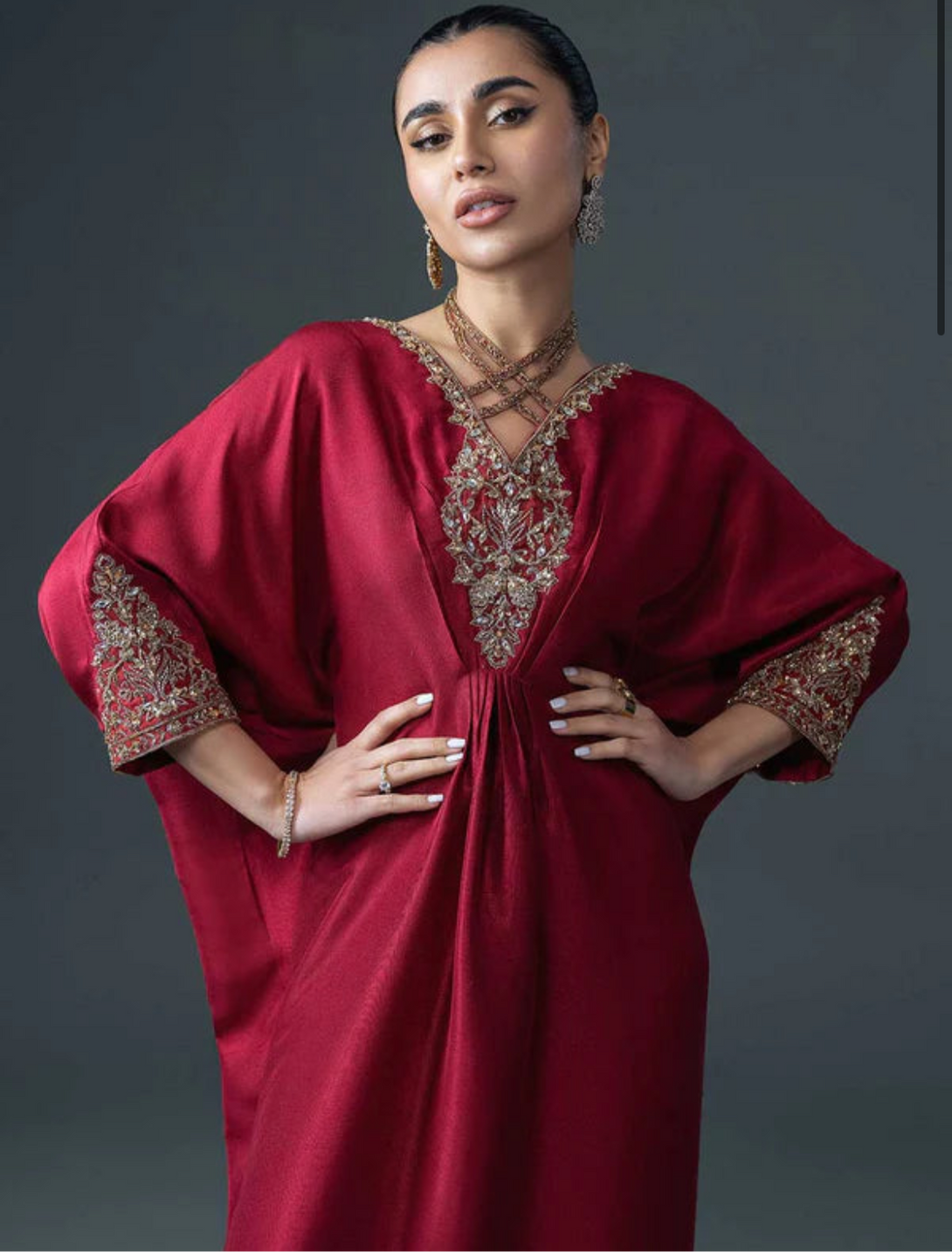 Exude fusion charm in our kaftan. Featuring exquisite craftsmanship of jeweled work and hand-touched accents, artfully embedded on pure raw silk canvas. The elegant scrappy v-neckline and side slits is a killer combo for any occasion.