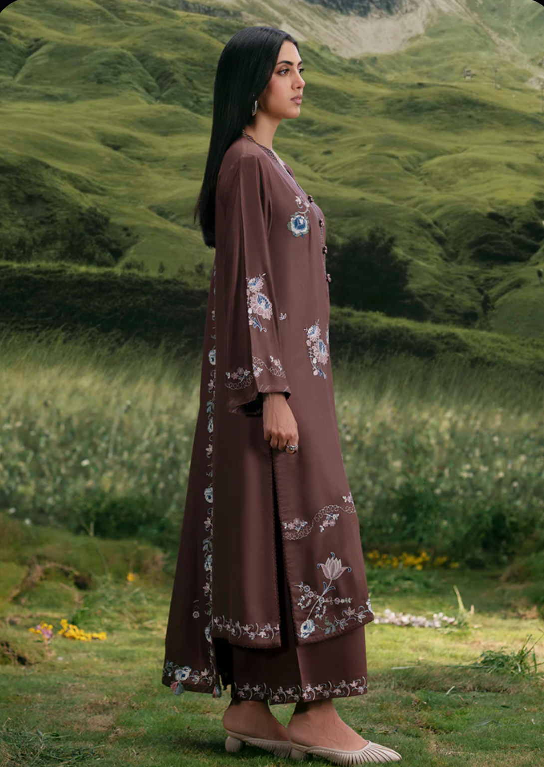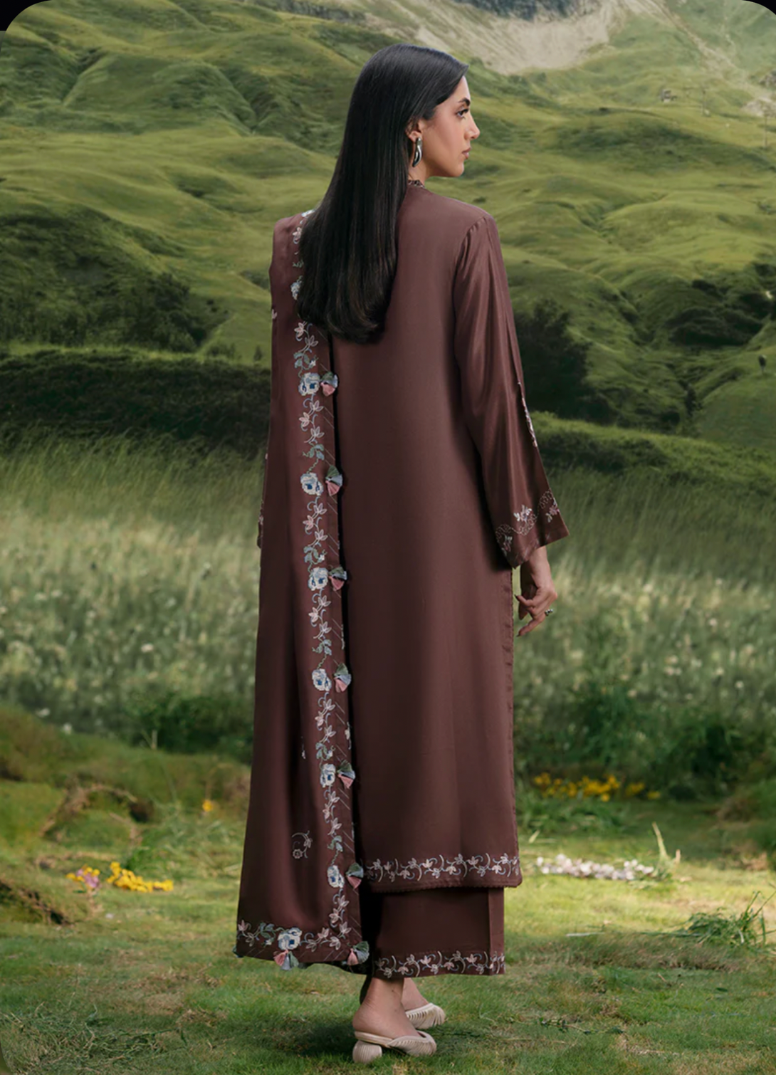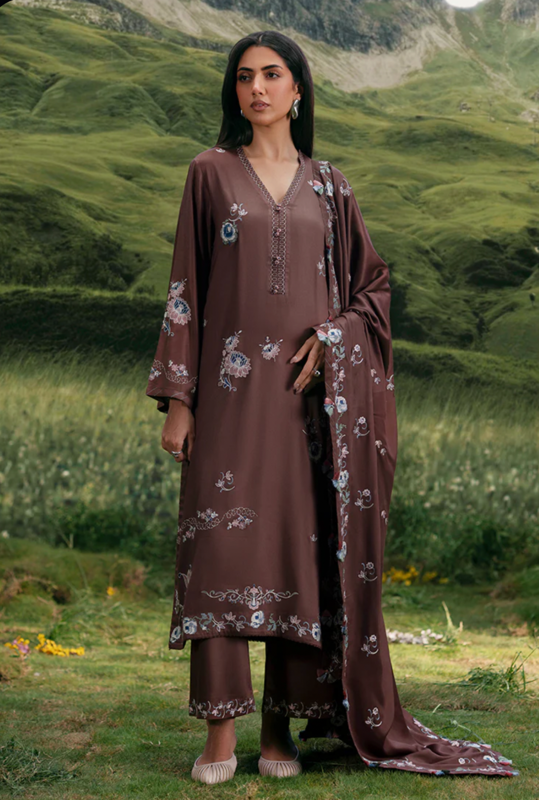 Roshanaz in Dark Brown from our Winterkari '25 Collection. An embroidered twill viscose 3pc unstitched outfit.