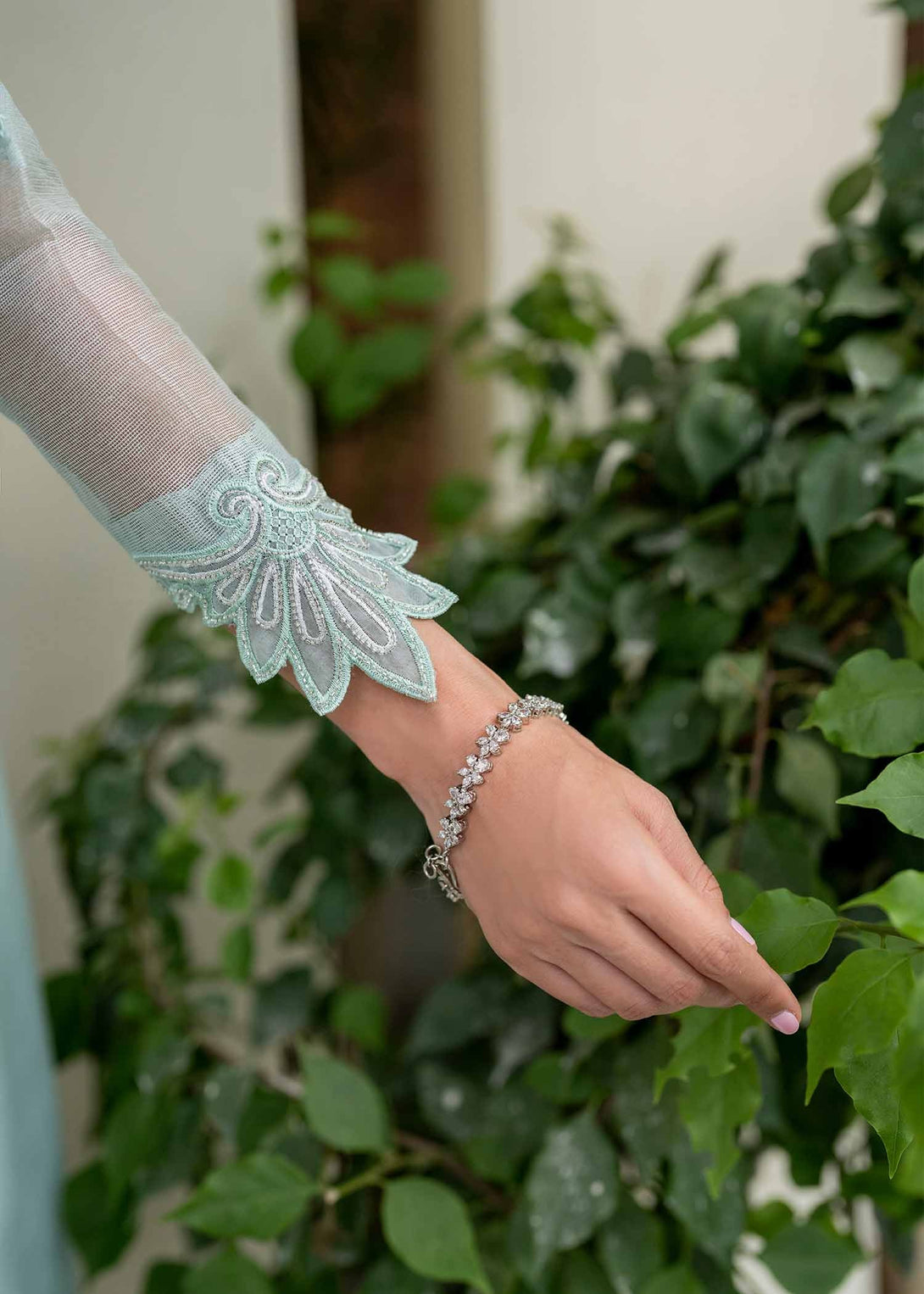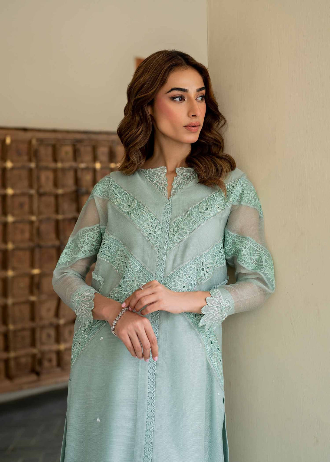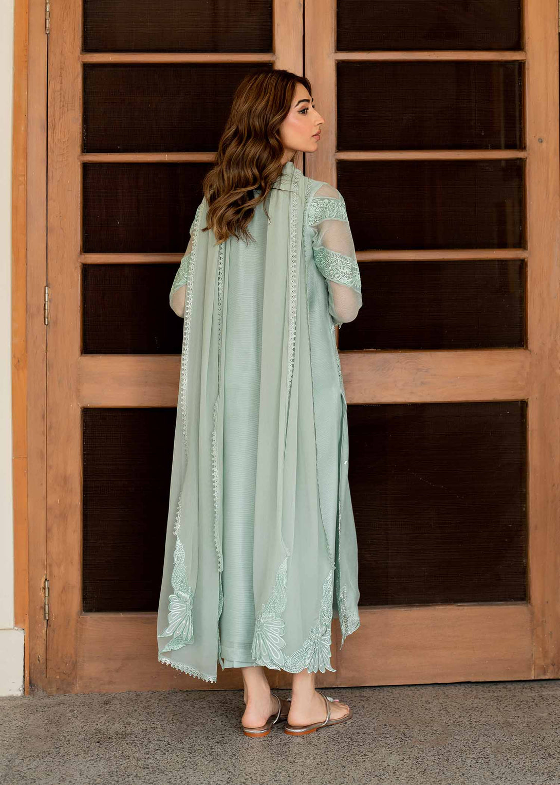 Experience the serene charm of our Sage stitched outfit, designed to add a refreshing touch to your spring wardrobe! The ensemble comprises of a khaddi net shirt, viscose trousers completing the look with a chiffon dupatta featuring interlace details, this outfit exudes elegance and sophistication. Wear with your minimal jewelry to let the outfit shine.