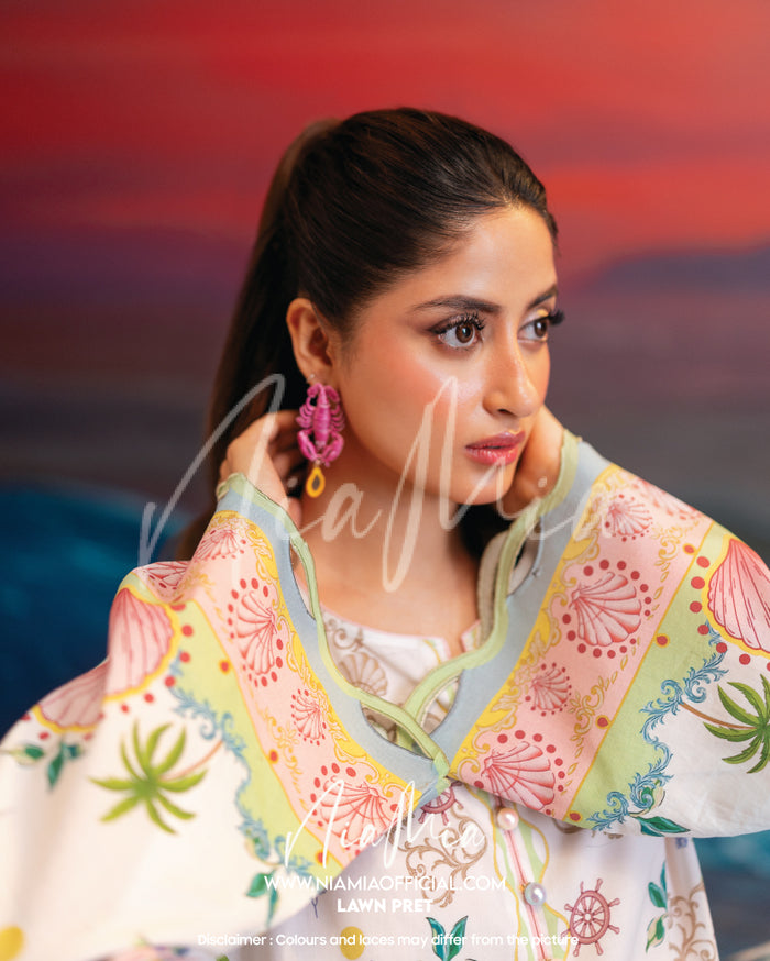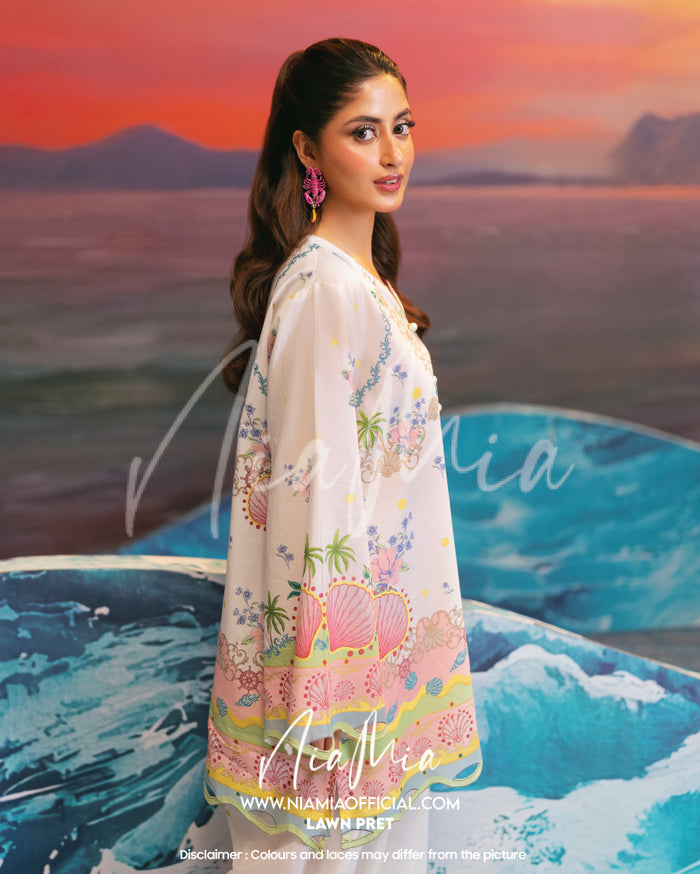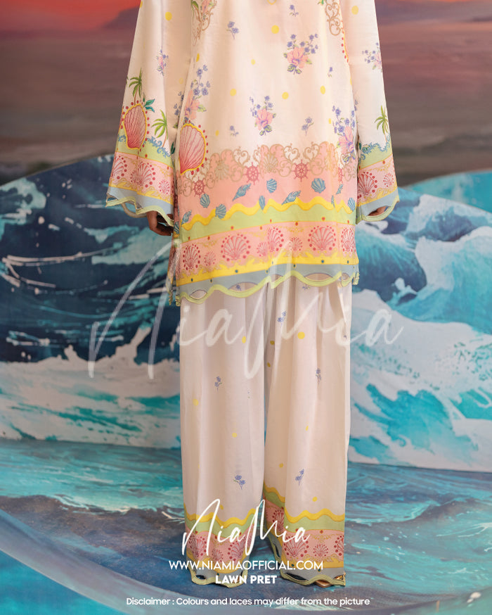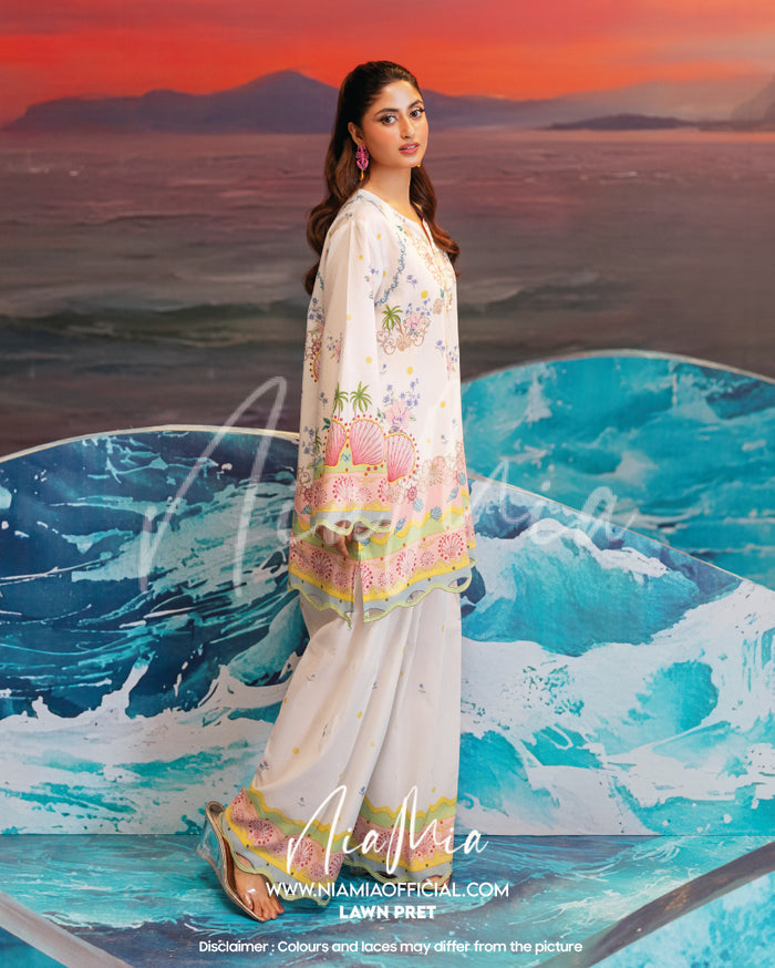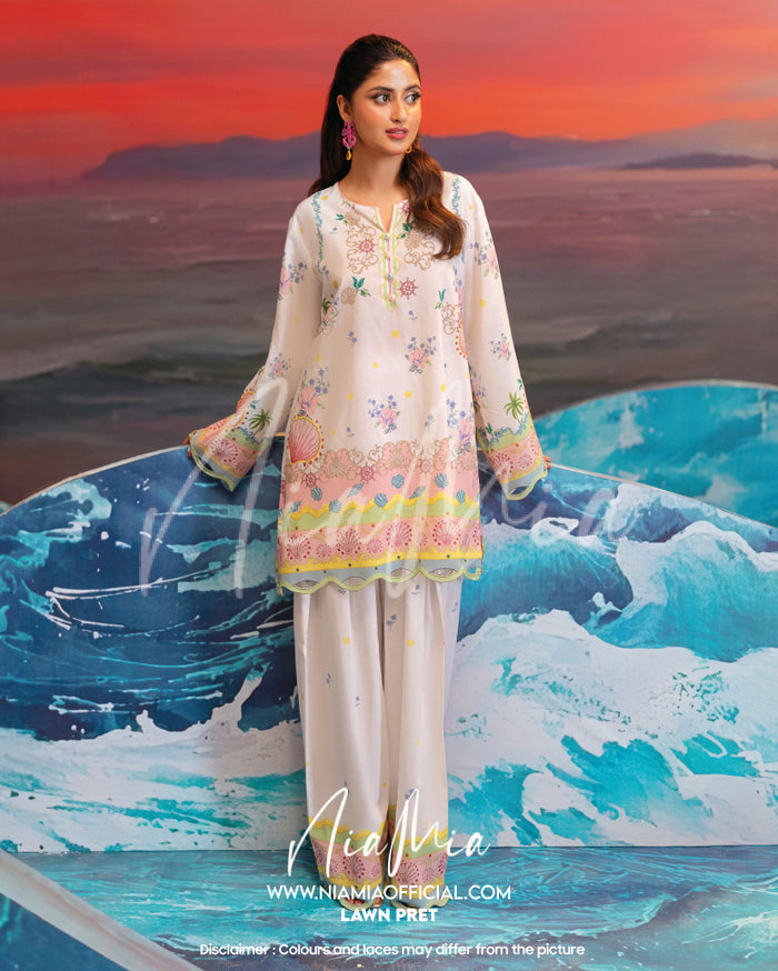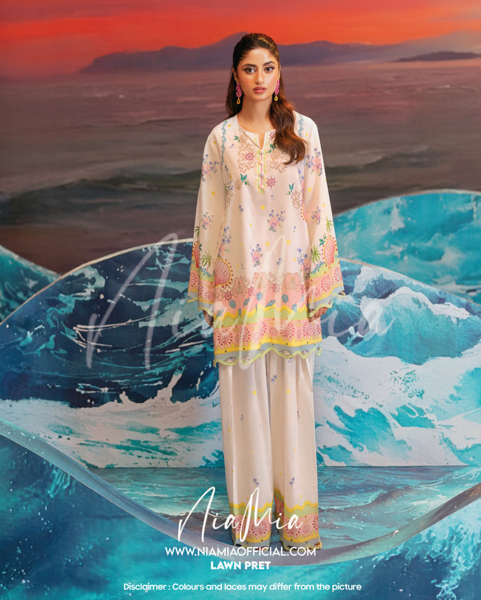 A two-piece printed set on a fresh white base, brought to life with soft blue, green, and pink motifs. The straight silhouette features cutwork embroidery along the shirt hem and sleeves, with matching cutwork accents on the shalwar hem for a perfectly coordinated finish. A breezy yet polished choice for warm days.