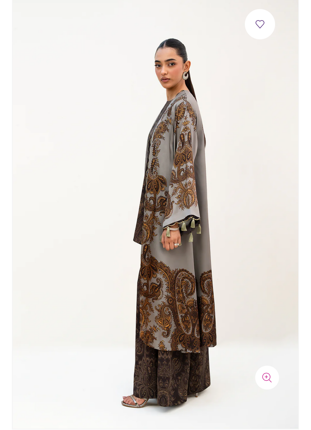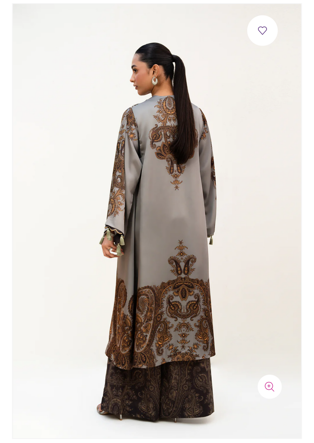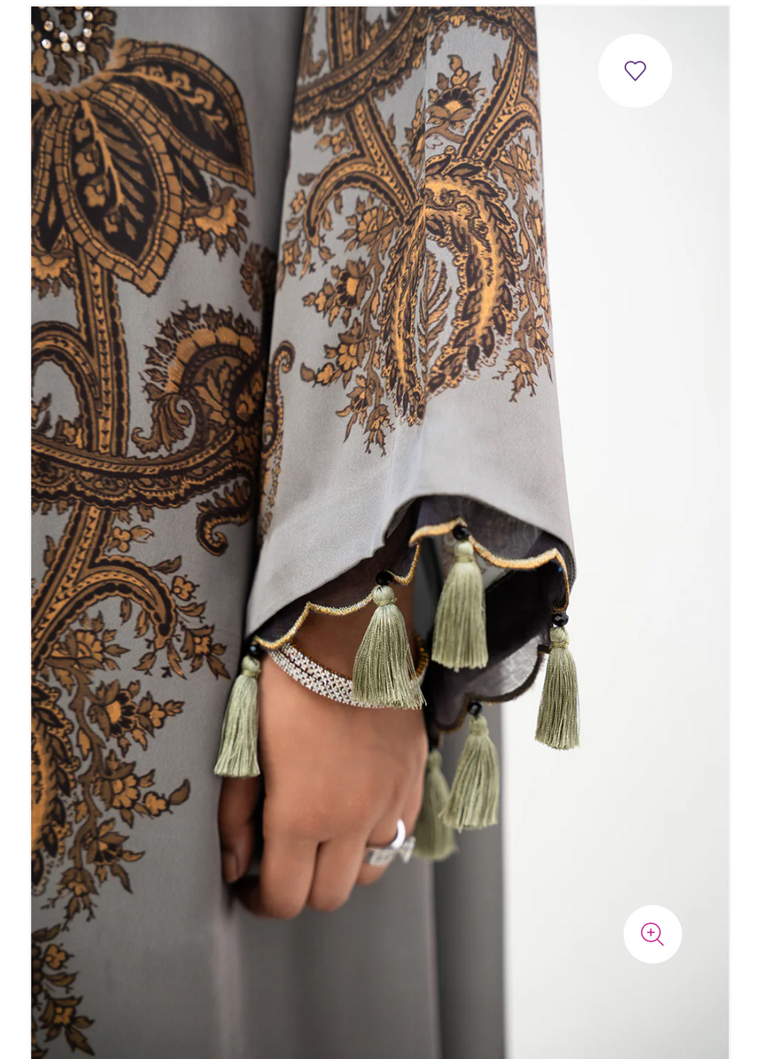 - This shrug made in grey soft charmeuse silk fabric in print features front-open silhouette with scalloped organza detail, square armholes, full length flared sleeves and scalloped organza detail and tassel hanging along the sleeve hem. The front panels are embellished.