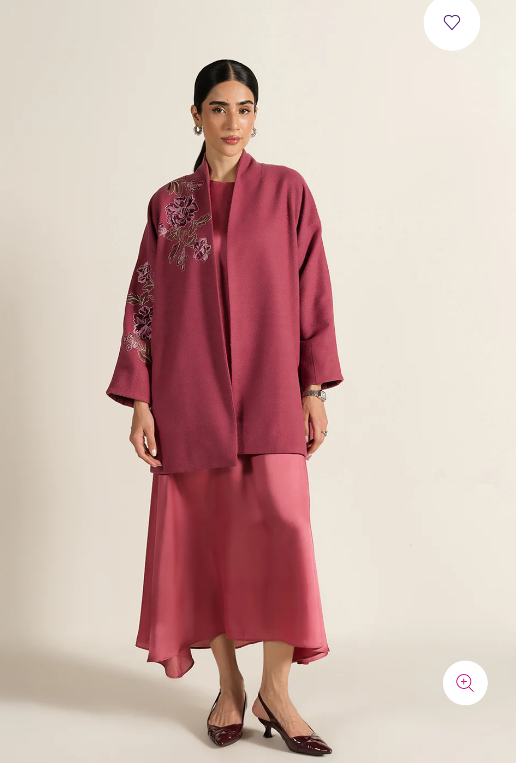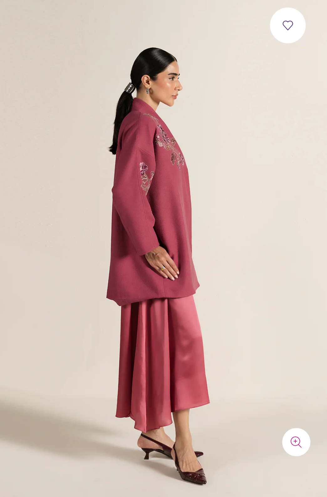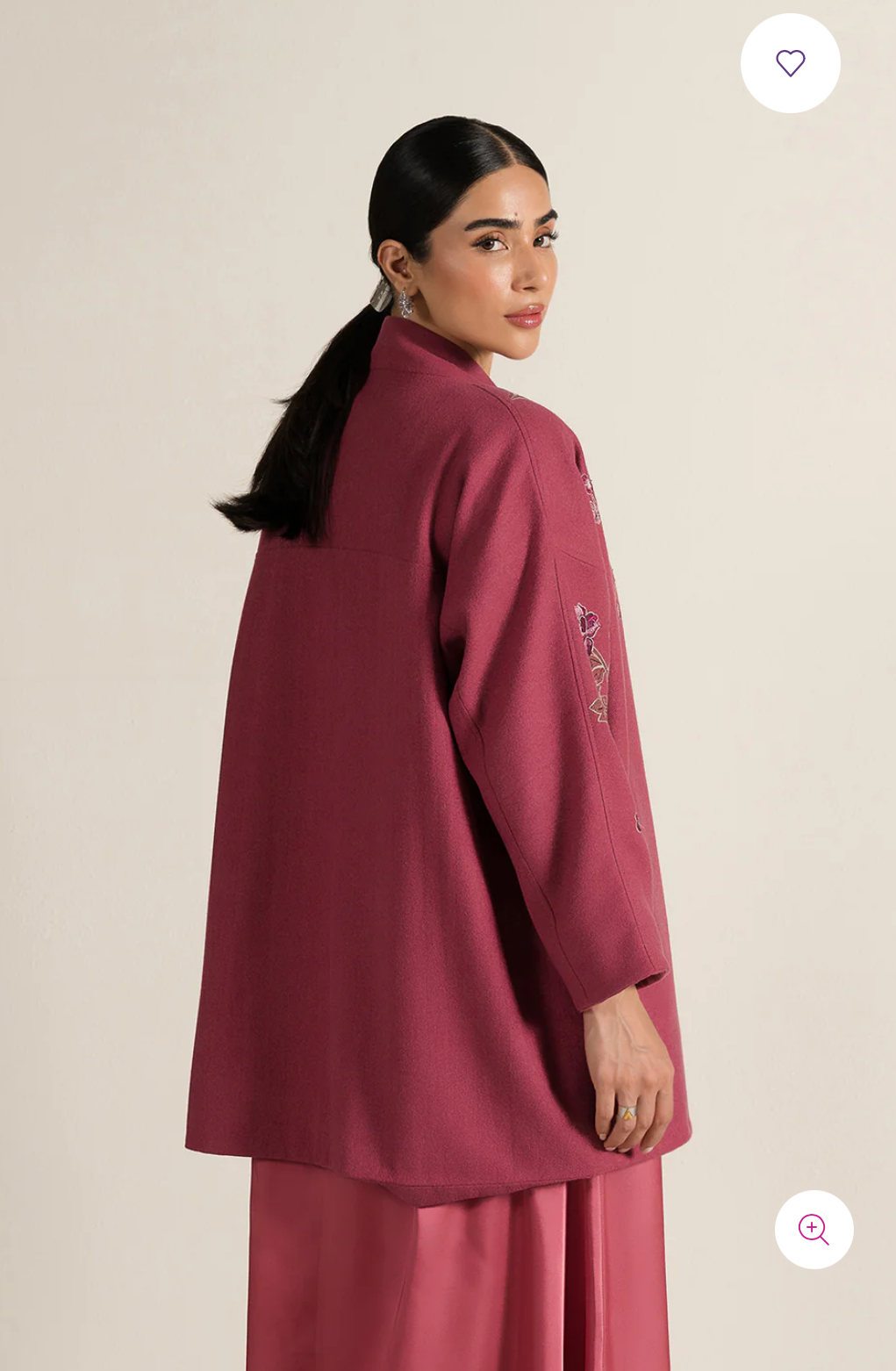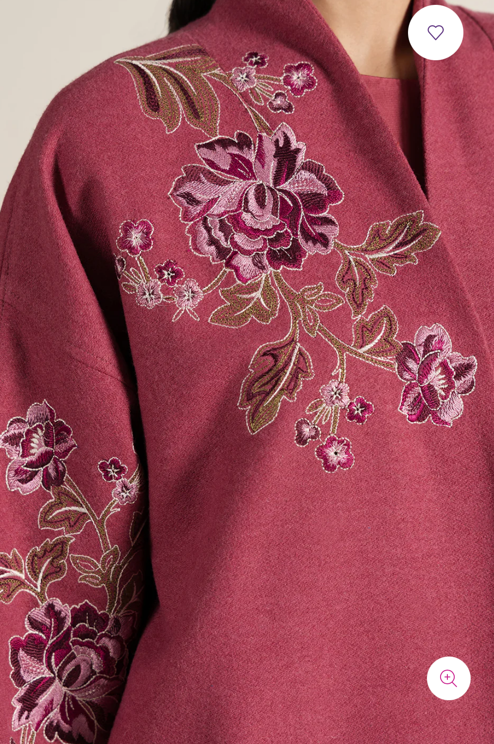 - Crafted in soft wool, this embroidered coat features an extended neckline with darts and shoulder dart detailing. Adorned with multihead embroidery on the right front and right sleeve, it is designed with dropped shoulders, straight full-length sleeves with front darts, and yoke detailing throughout the sleeves. Topstitch detailing throughout and a center back seam enhance the tailored finish, while an attached silk lining adds a luxurious touch.