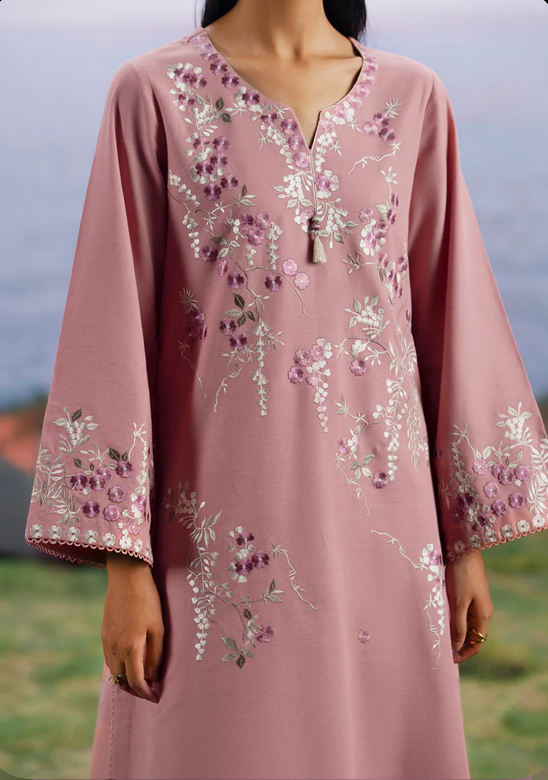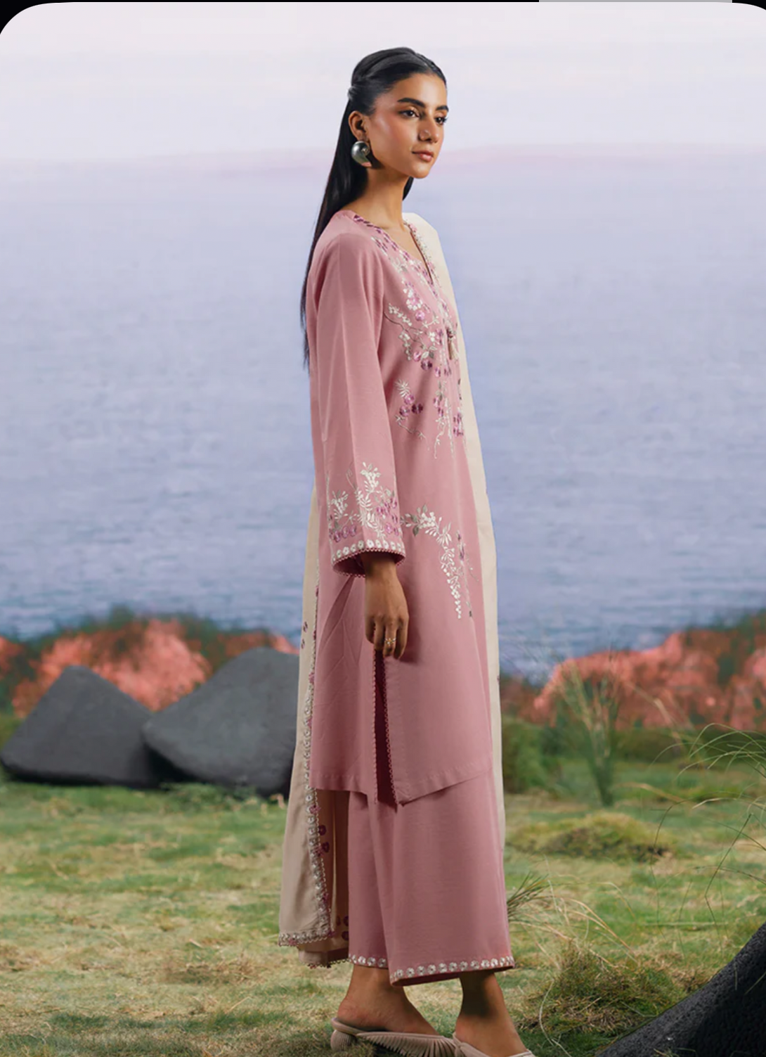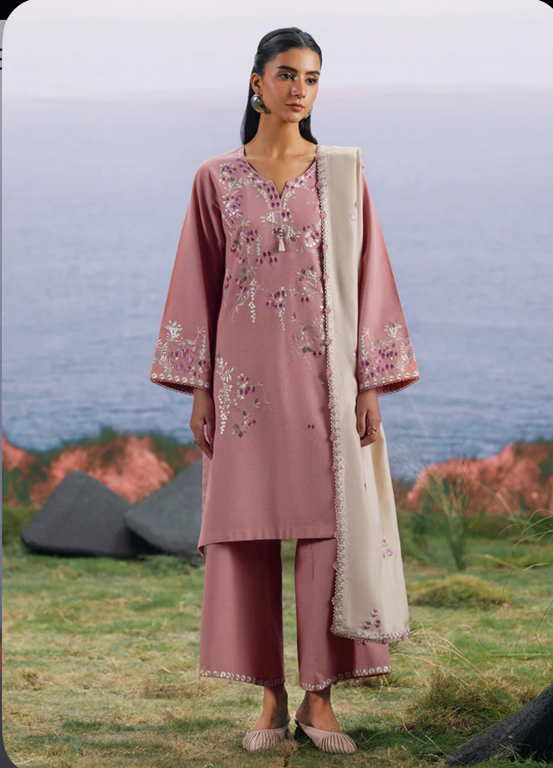 Shireen in Coral Pink/Beige from our Winterkari '25 Collection. An embroidered khaddar 3pc unstitched outfit paired with khaddar trousers & an acrylic shawl.