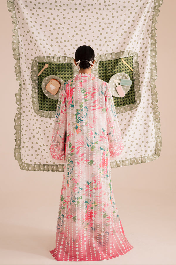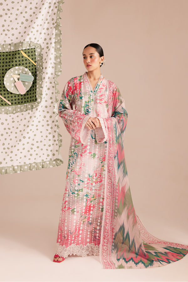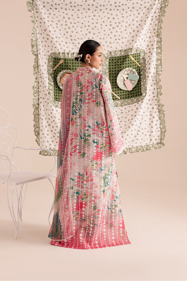 Embroidered lawn silk shirt, printed chiffon dupatta, printed lawn silk trouser