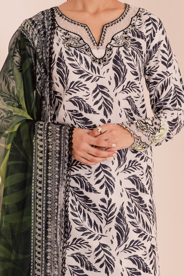 Embroidered lawn silk shirt, printed chiffon dupatta, printed lawn silk trouser