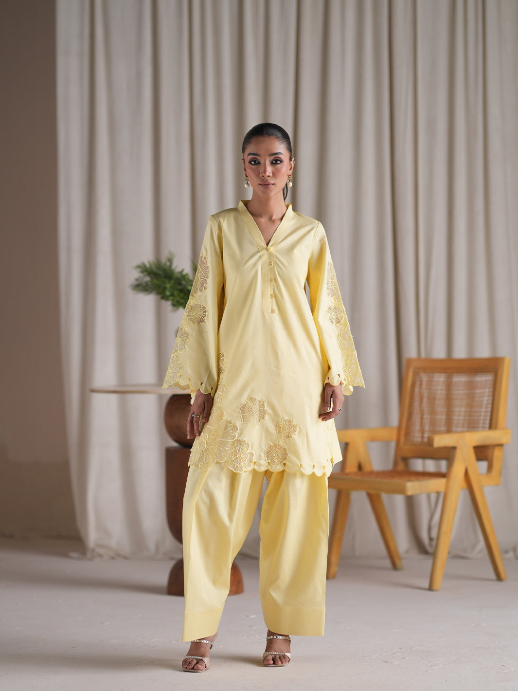Inspired by golden hour light, this butter yellow two piece is delicate, optimistic, and softly