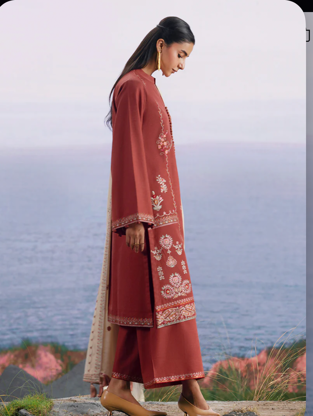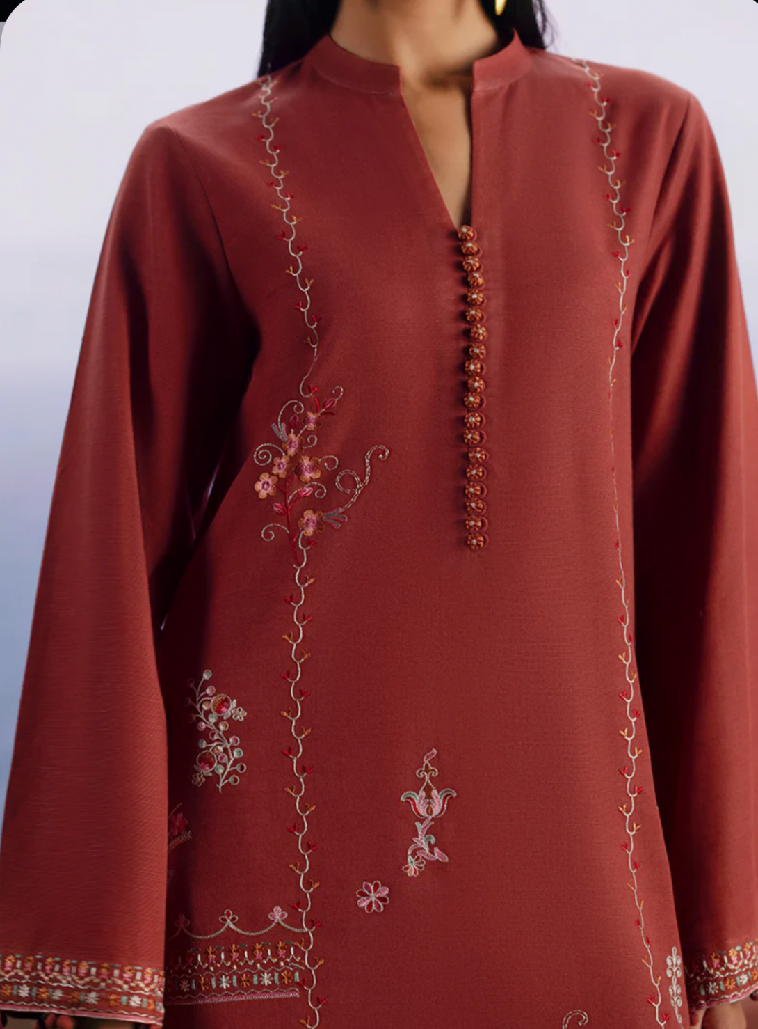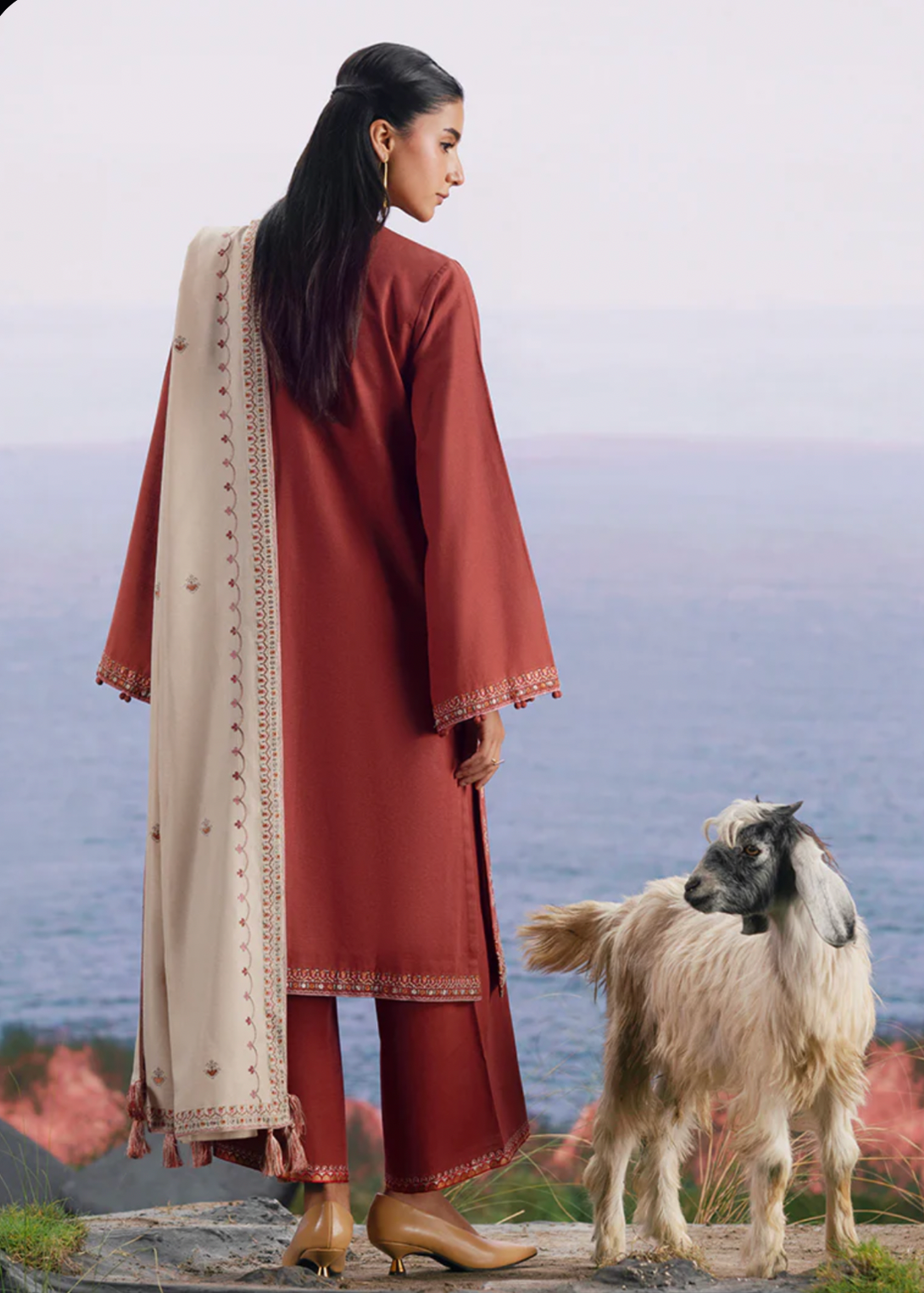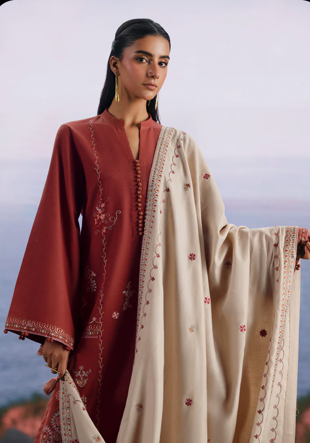 Taraneh in Rust/Beige from our Winterkari '25 Collection. An embroidered khaddar 3pc unstitched outfit paired with khaddar trousers & an acrylic shawl.