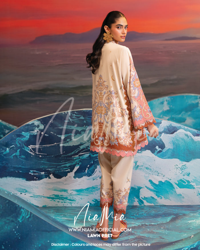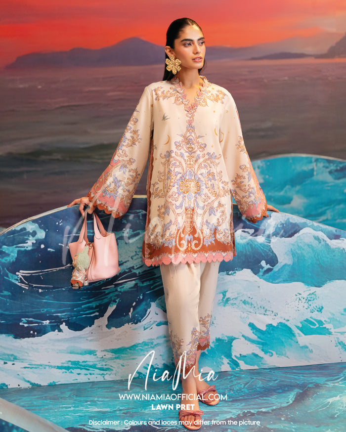 A two-piece printed set in soft beige, brought to life with warm brown motifs. The shirt features a soft heart-shaped neckline adorned with embroidered and cutwork 3D hearts, adding a playful yet refined touch. Finished with delicate border detailing on the sleeves and hem, and paired with a matching printed shalwar for a coordinated summer look.