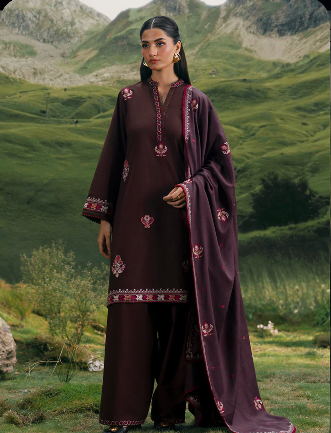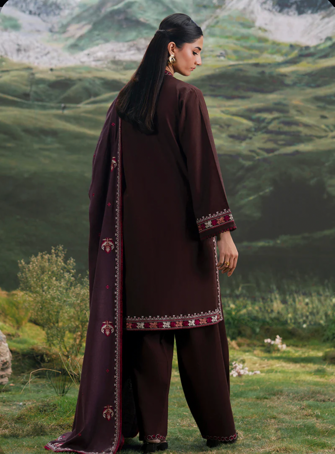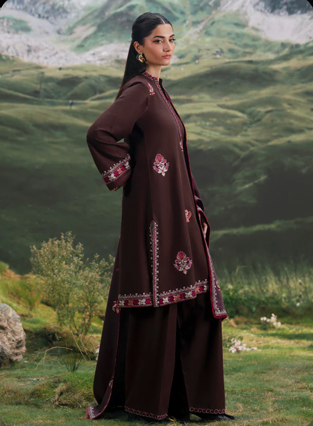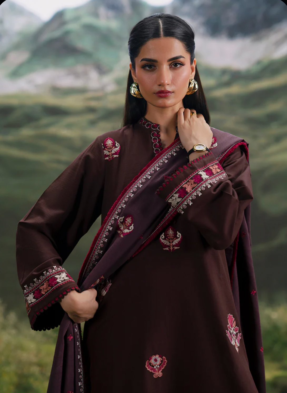 Zerreen in Dark Brown from our Winterkari '25 Collection. An embroidered khaddar 3pc unstitched outfit paired with khaddar trousers & an acrylic shawl.