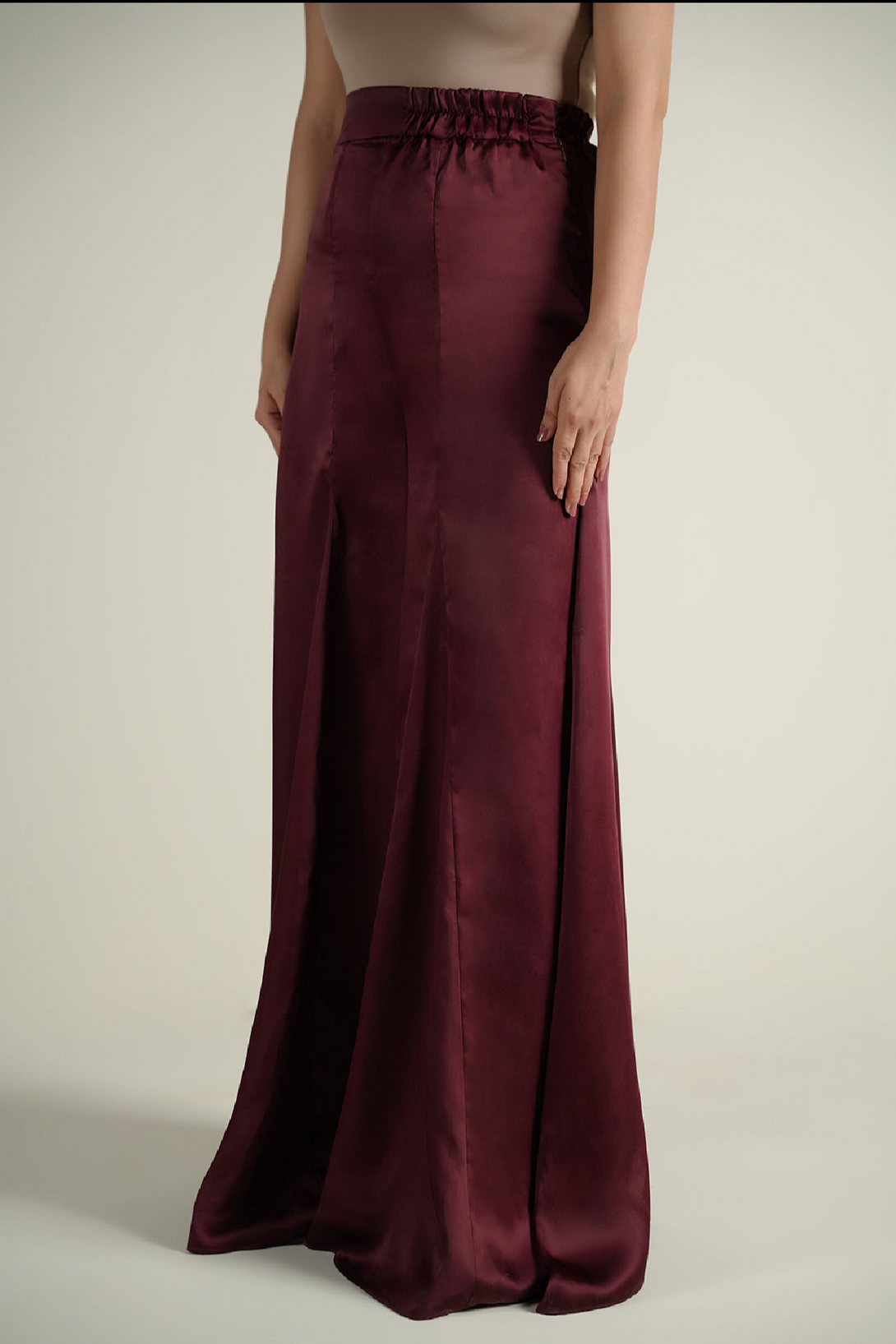 - A deep burgundy Charmeuse silk pant is cut in flared paneled silhouette featuring a side zip closure and a hook and eye opening. Can be paired with "Zoril Side Drape Top" to get the look of your dreams.