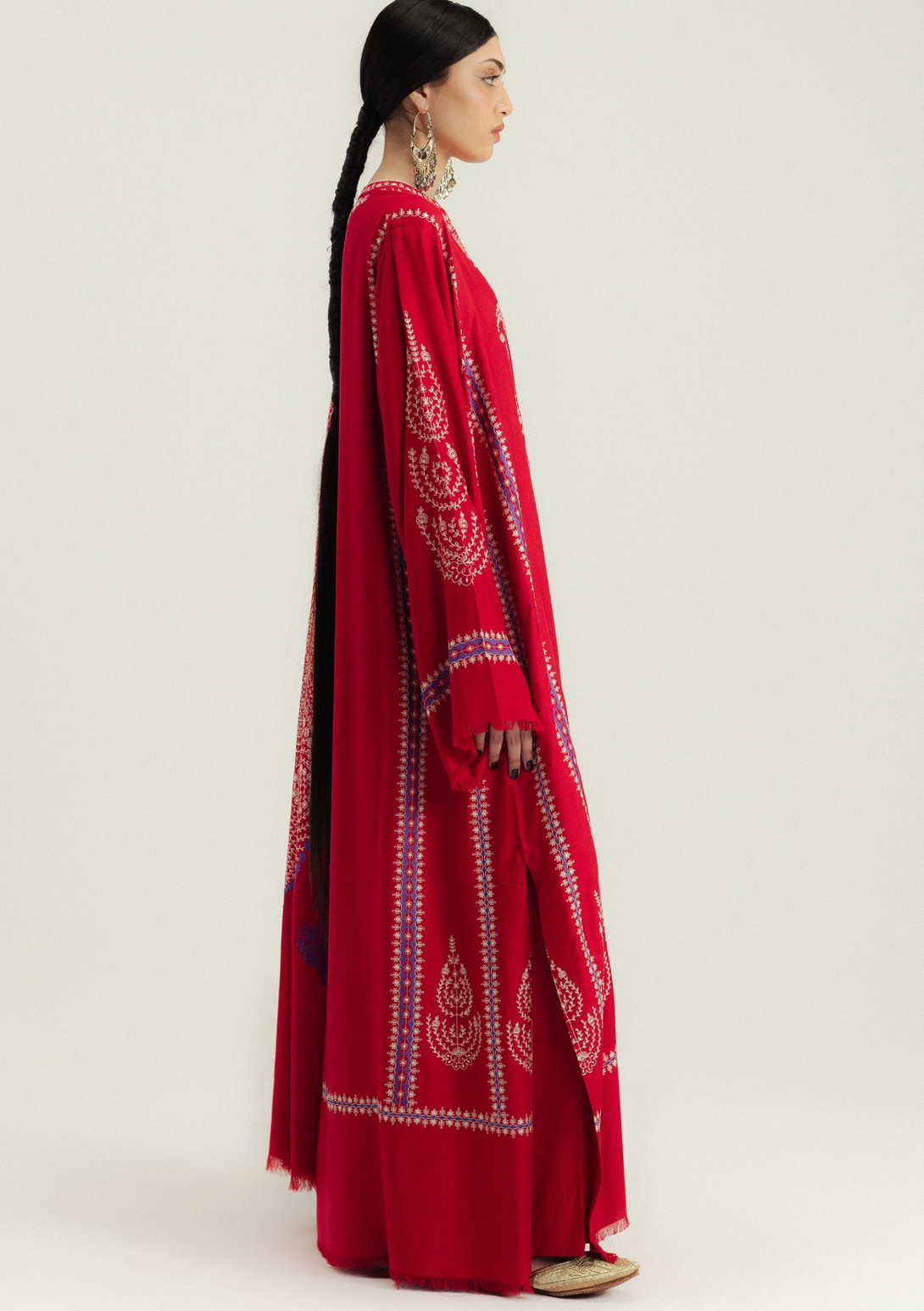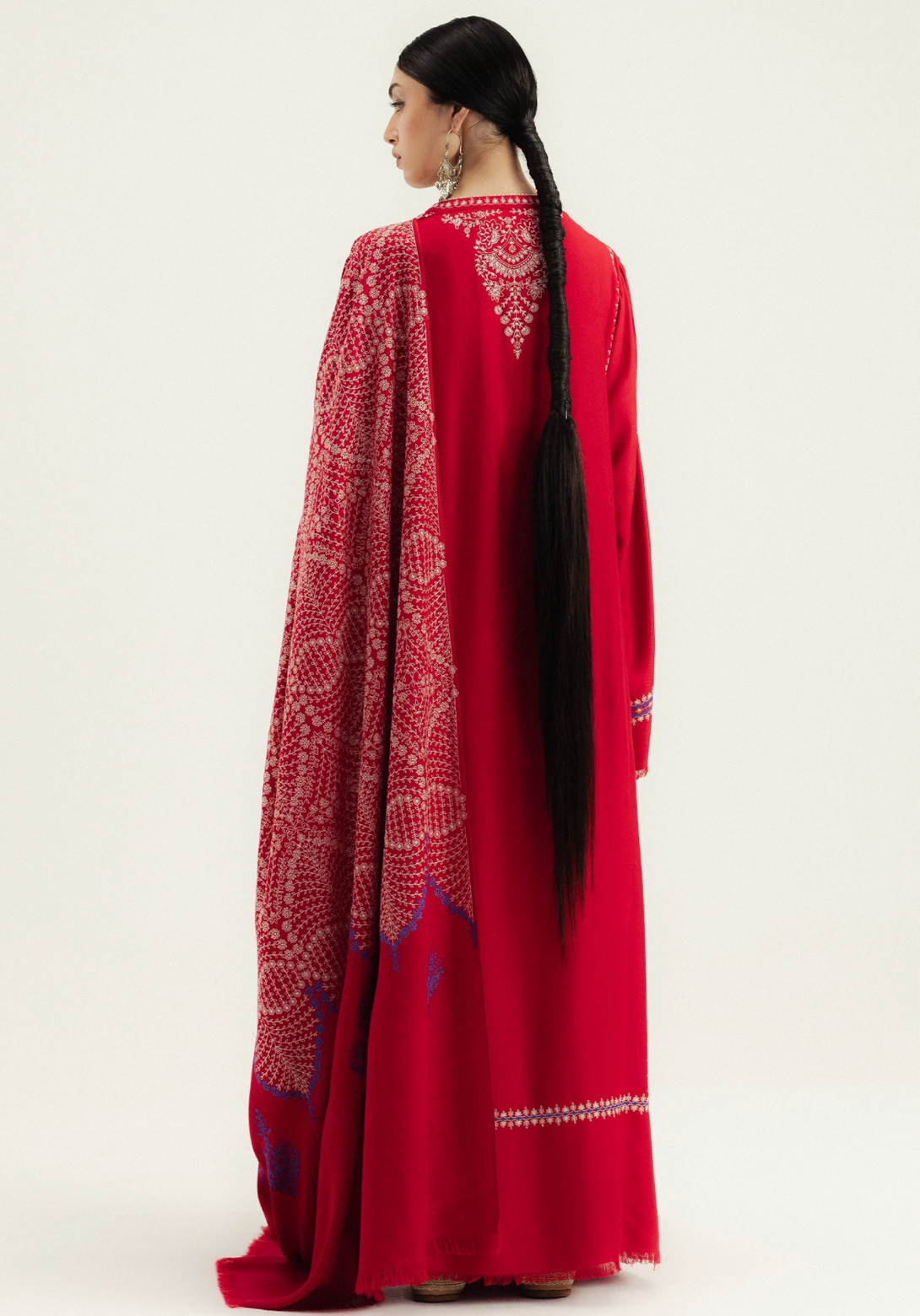 A signature red five-paneled kurta adorned with intricate Kashmiri embroidery on the front and back, showcasing fine craftsmanship and detail. Paired with a heavily embroidered red marina shawl featuring a pop of cobalt blue and matching tonal trousers, this ensemble reflects warmth, heritage, and timeless elegance.