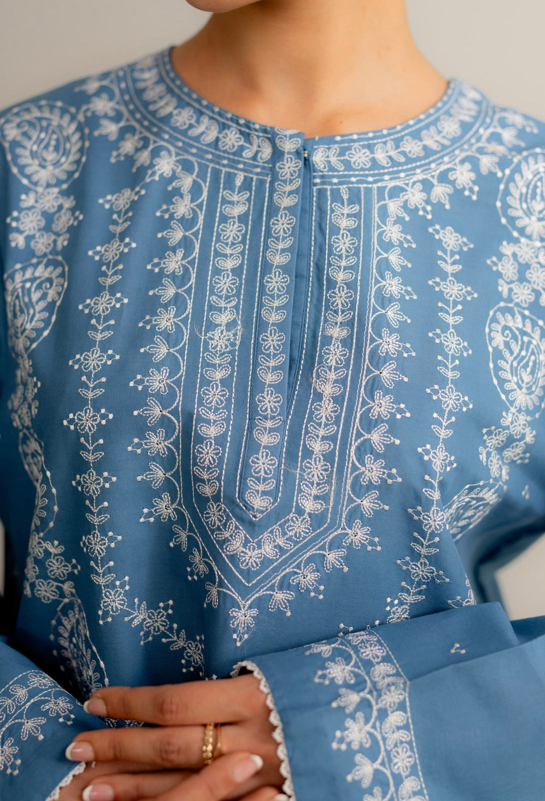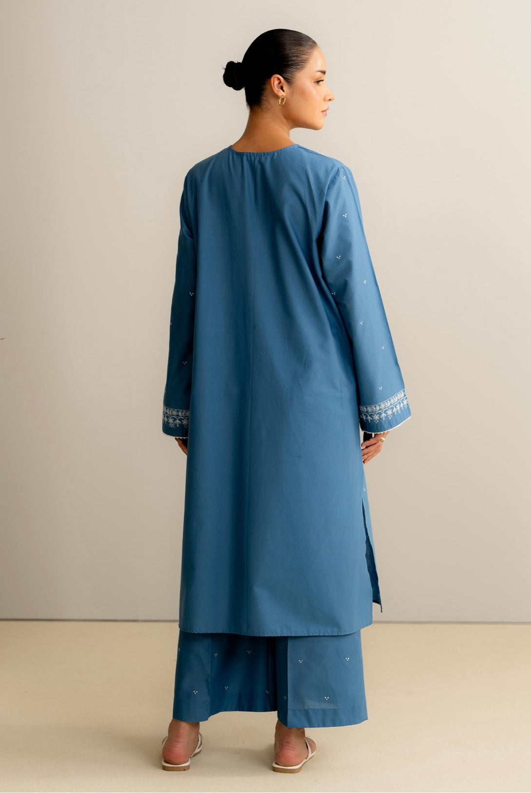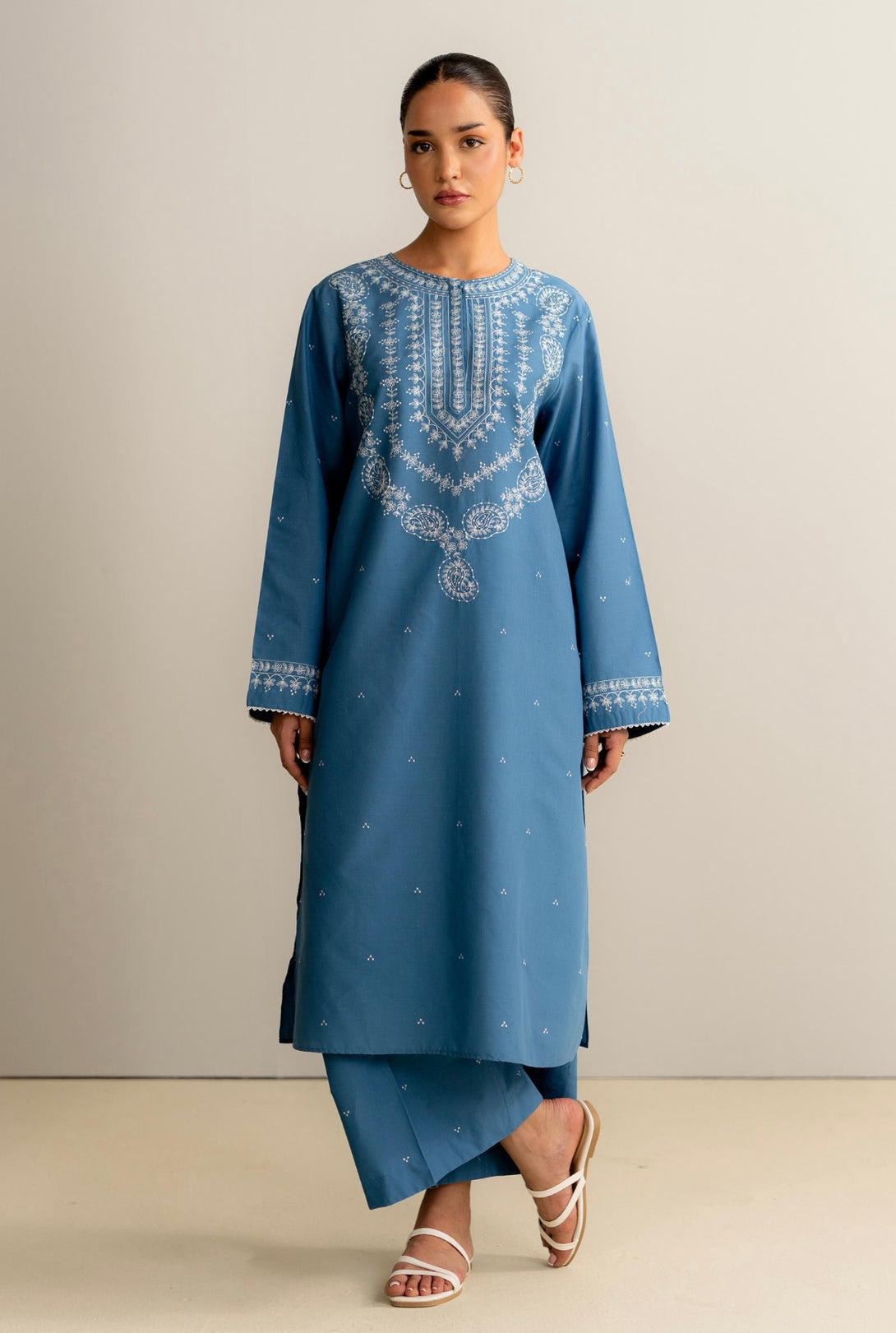 A relaxed, loose-fit kurta with fine embroidery on the front, sleeves, and neckline. It’s paired with cropped trousers featuring wide hems and subtle embroidery detailing for a balanced, everyday look with a touch of craft.